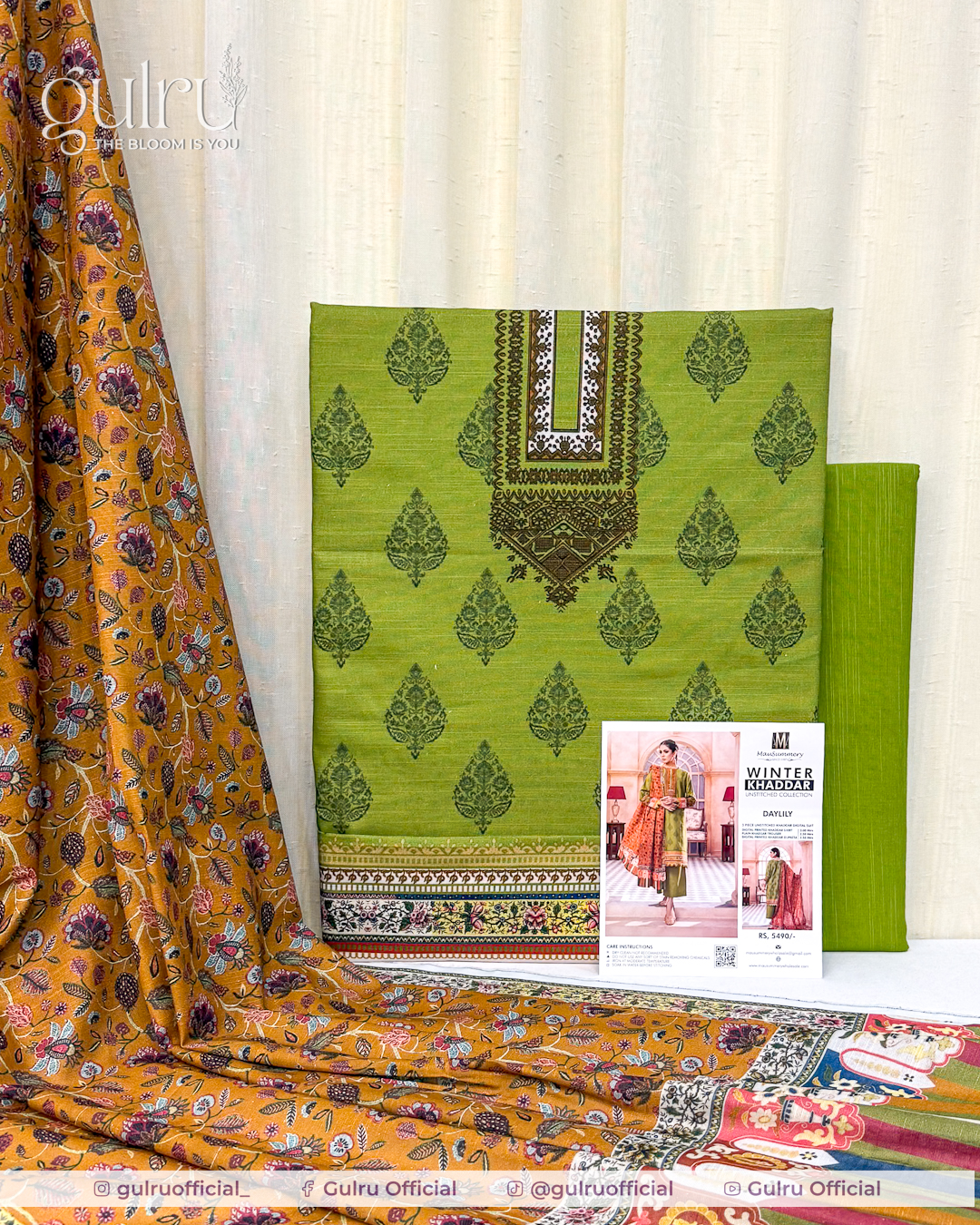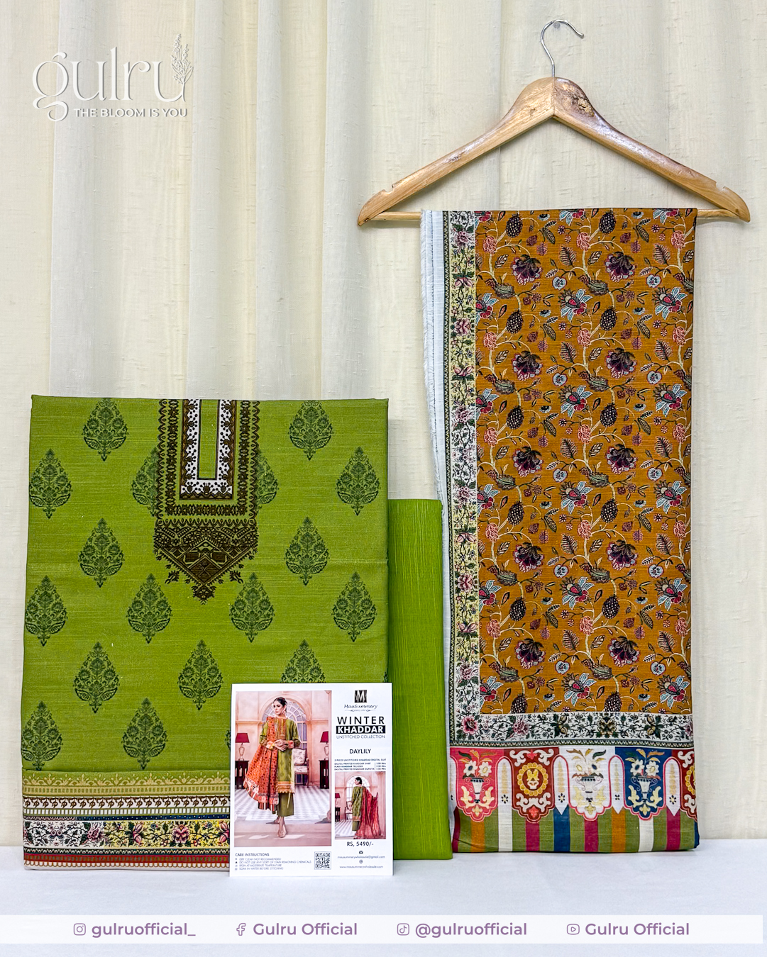 A fresh lime set with a centered neckline panel, tidy buta repeats, and a slim ornamental border that stitches cleanly in straight or A-line cuts. The mustard dupatta brings warm contrast with all-over florals and coordinated borders, so the outfit looks complete without heavy extras. A solid-dyed trouser keeps the look neat for the office, daily wear, and casual meetups.