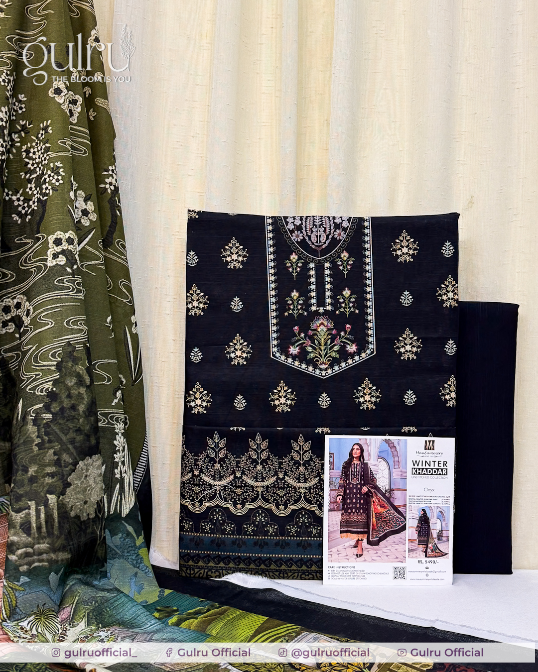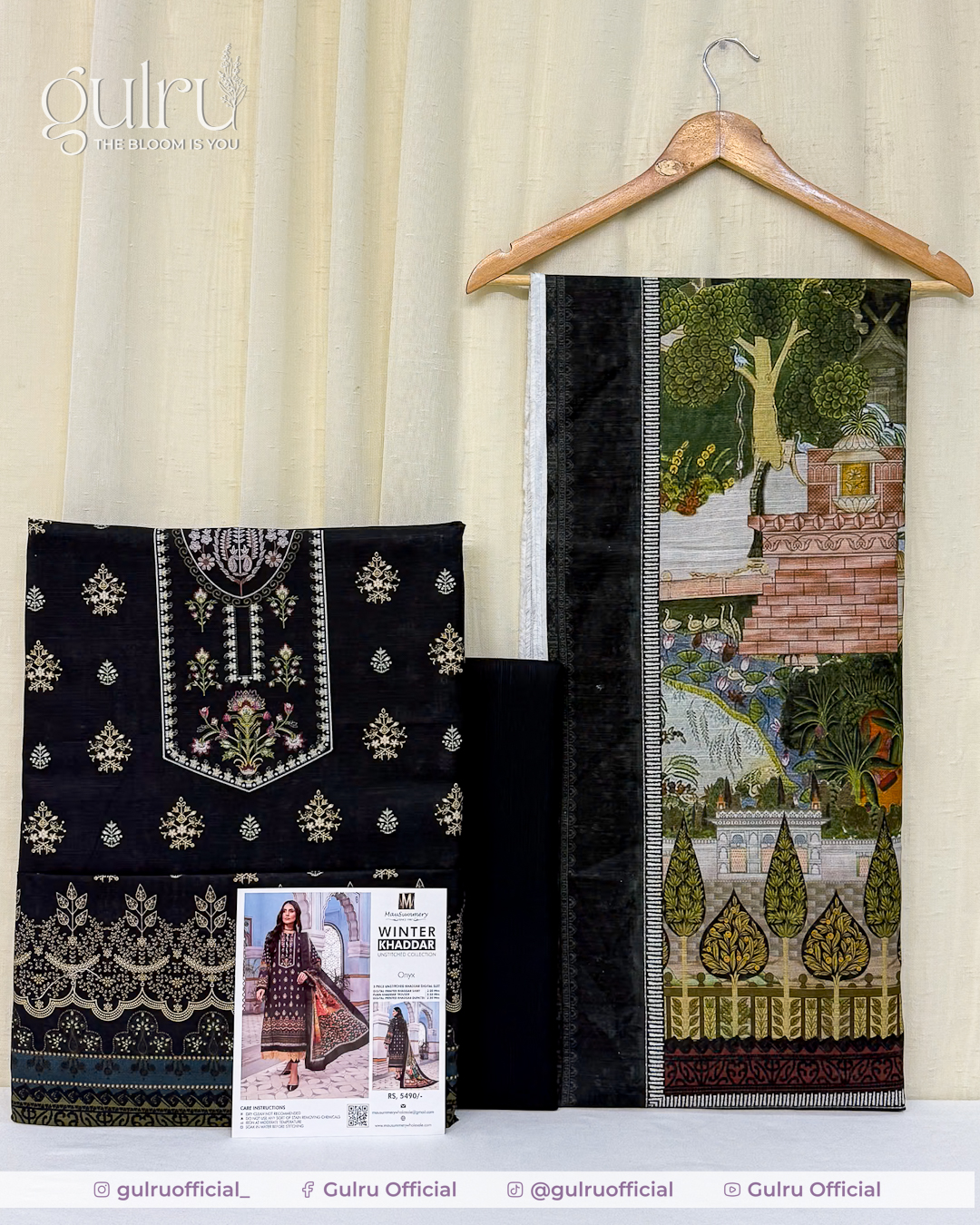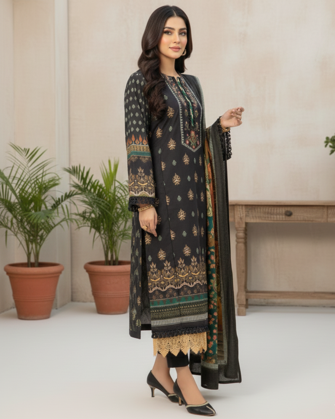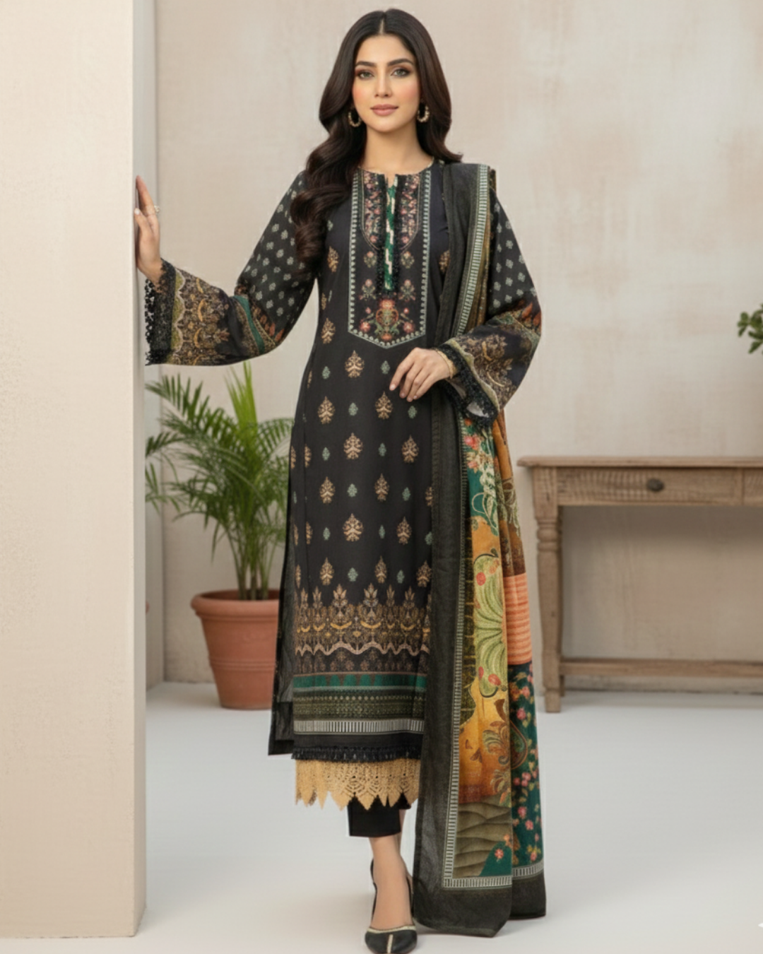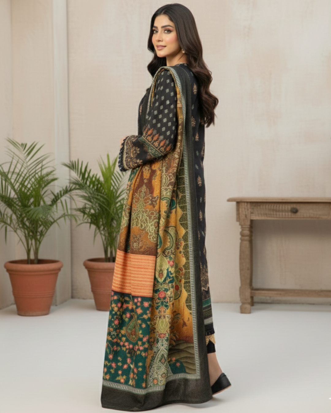 Black shirt with small ethnic motifs and neat borders, paired with a multicolor garden-style printed dupatta and plain black trouser. Clean winter set that stitches well in straight or A-line cuts and works for office, daily wear, and casual meetups.
