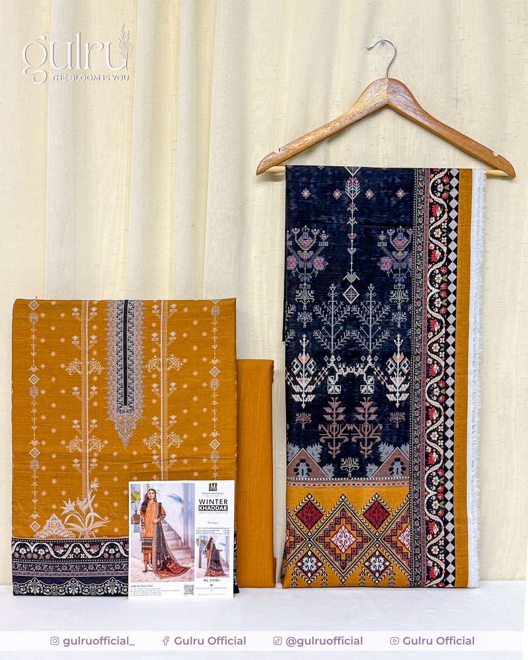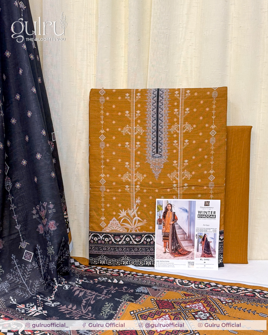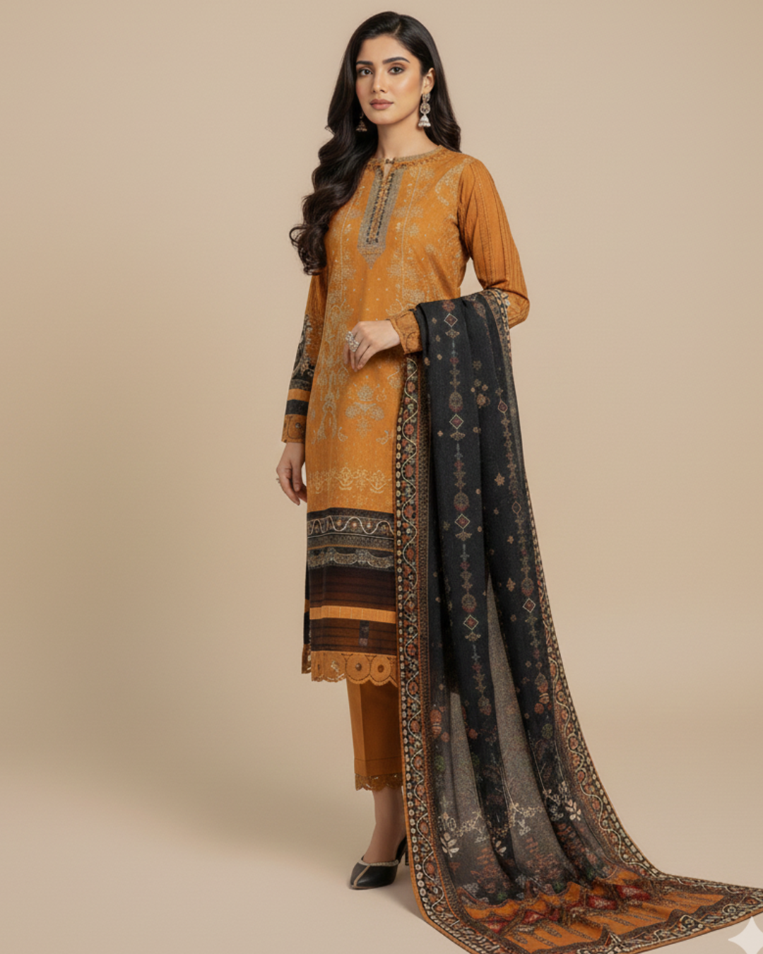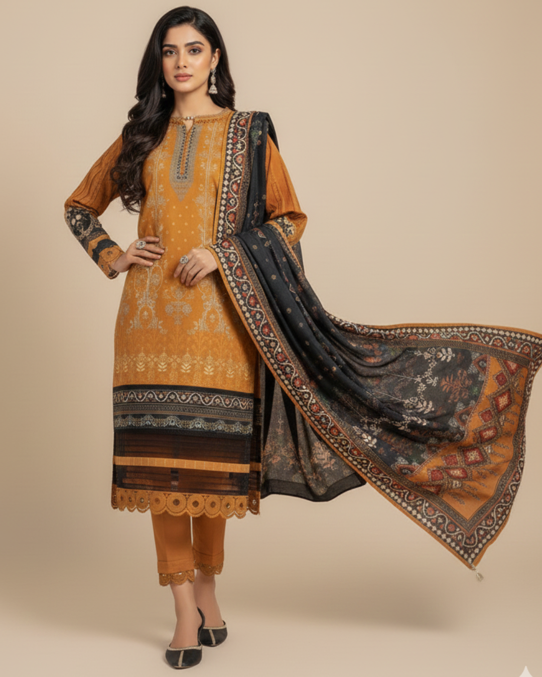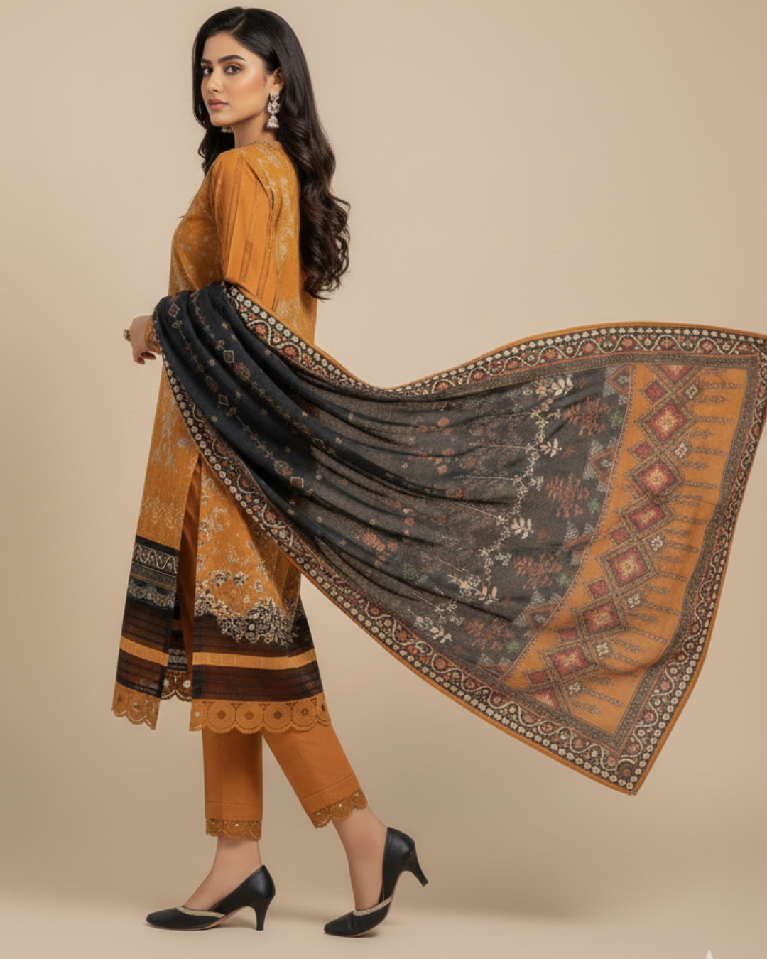 Mustard shirt with white and black ethnic motifs plus vertical panel and border work, paired with a black dupatta featuring tribal floral elements and geometric borders, and solid mustard trouser. Stitches well in straight or A-line cuts for office, daily wear, and casual meetups.