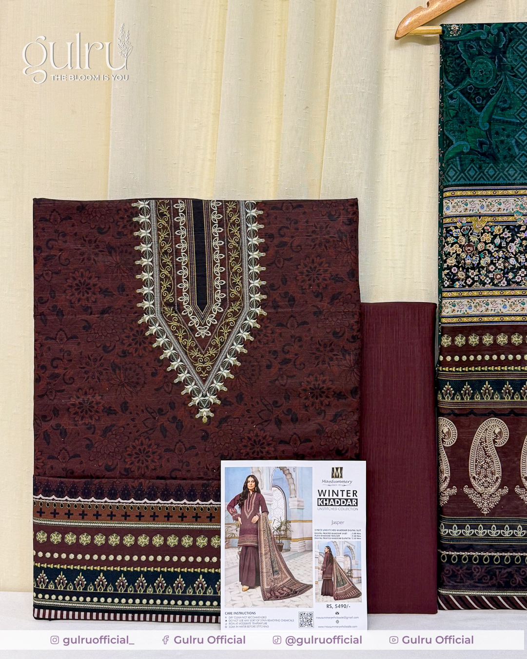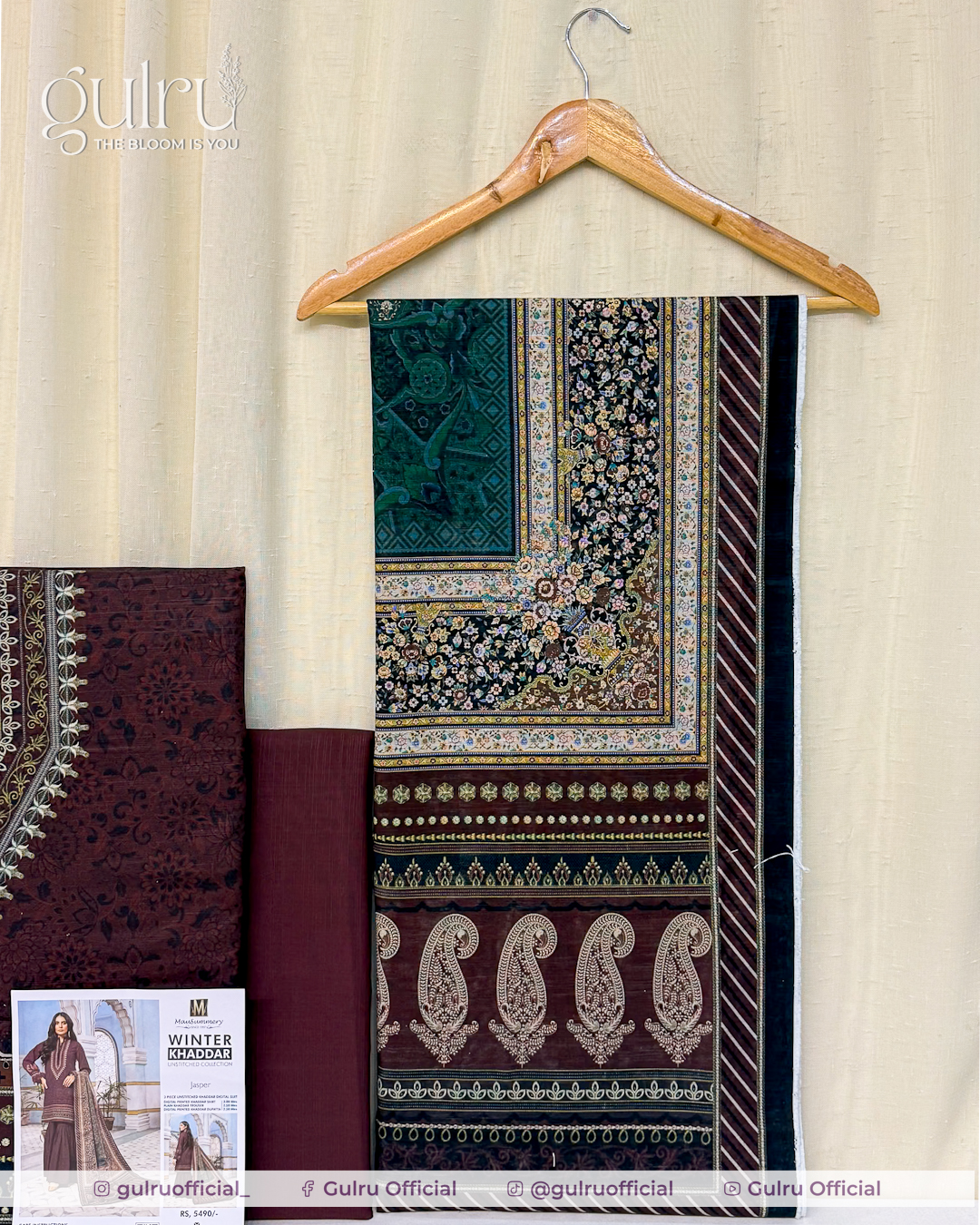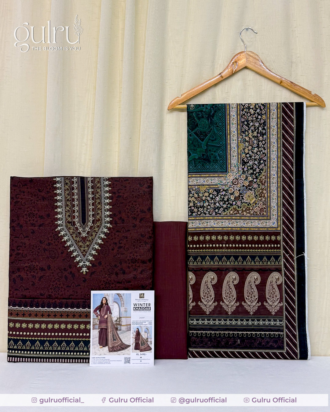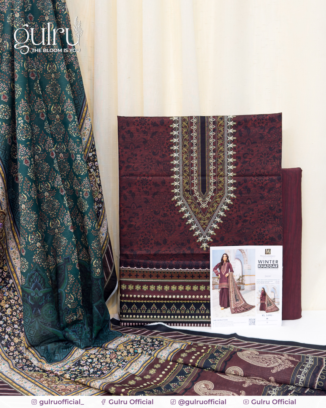 Maroon shirt with a statement V-panel neckline print and neat border detailing, easy to stitch in straight or A-line cuts. Deep green dupatta carries small floral and paisley elements with rich ethnic borders for contrast. Solid maroon trouser balance the set and keep the outfit clean. A wearable winter look suited for office, daily wear, and casual meetups.
