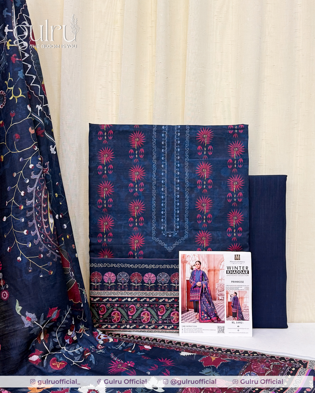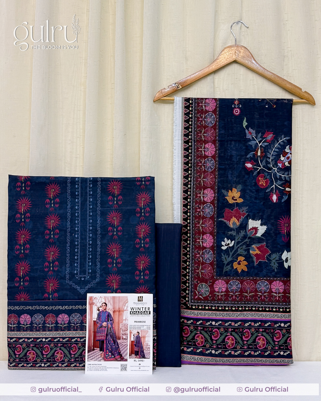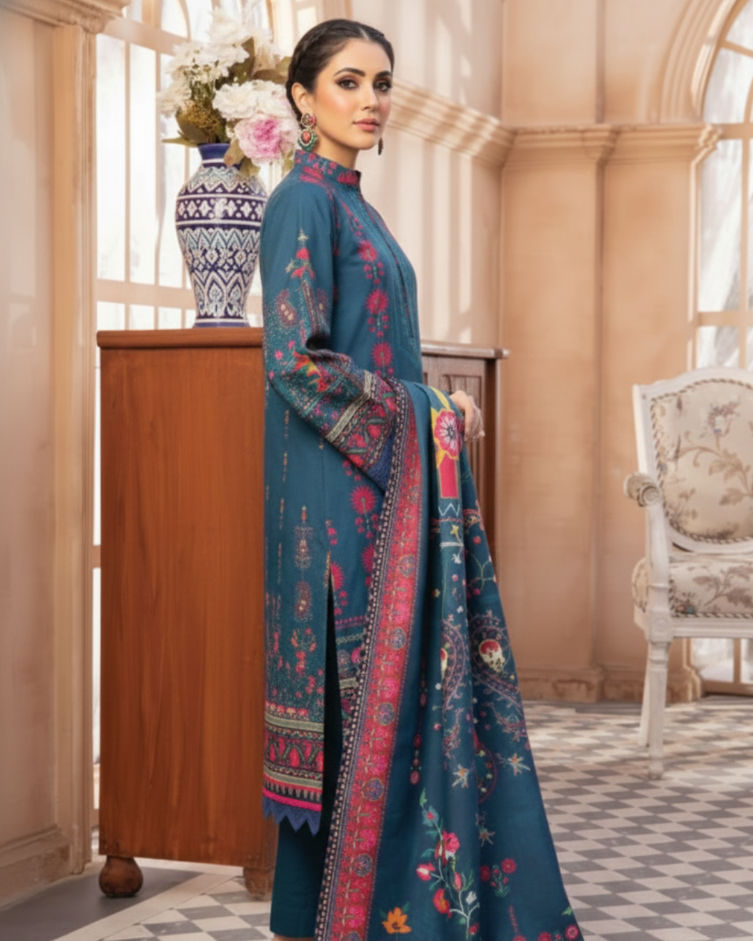 Navy shirt with a centered panel neckline, sunburst and bud motifs in pink and teal, and a tidy floral border. Dupatta carries large botanical artwork with vine details that add movement and contrast. Solid navy trouser keep the set clean and easy to stitch in straight or A-line cuts. A rich winter look that works for the office, daily wear, and casual meetups.