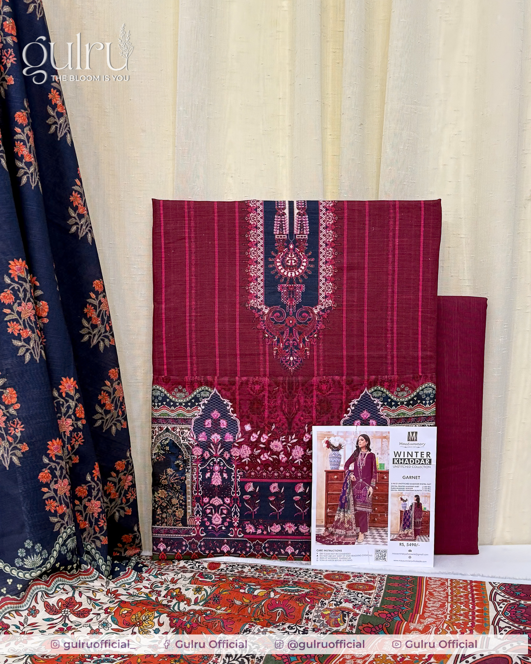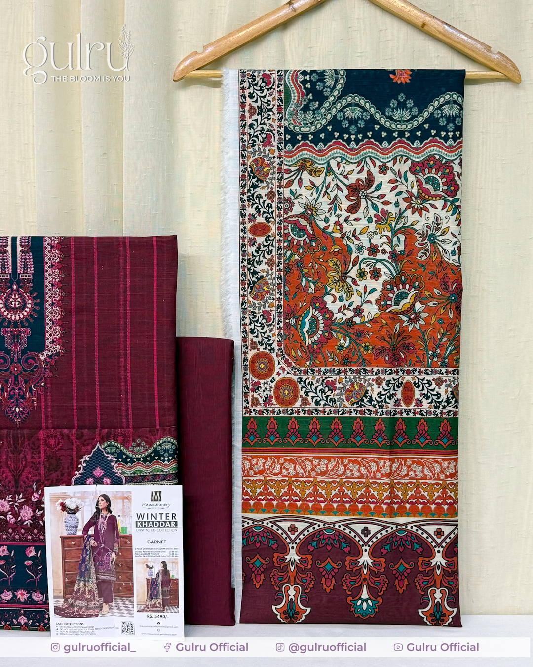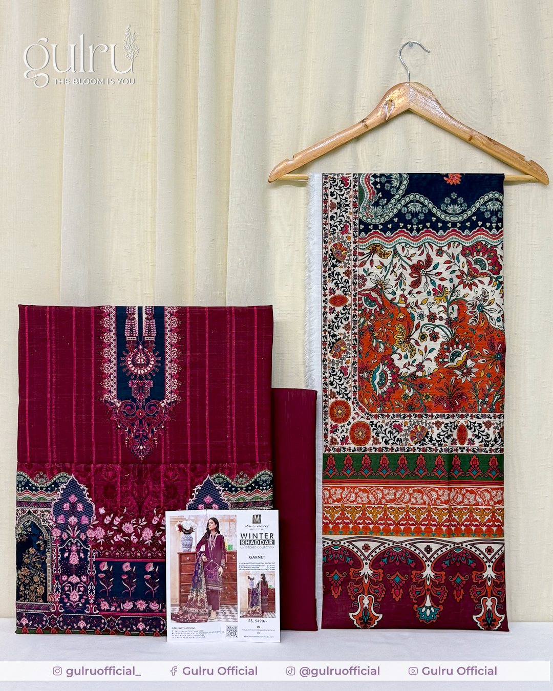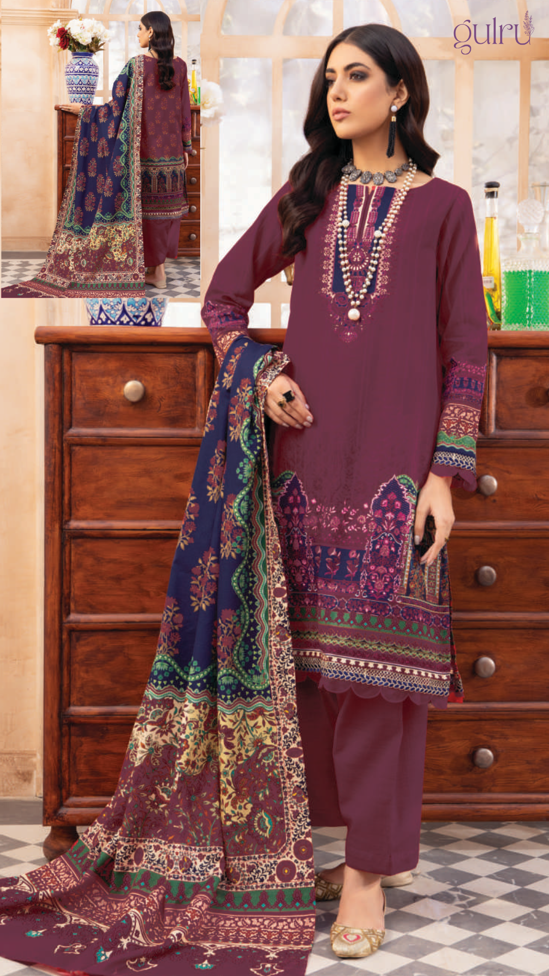 A rich maroon set with a statement neckline panel and subtle vertical texture that gives length to the shirt. The lower border carries architectural and floral motifs that stitch cleanly in straight or A-line cuts. The navy dupatta adds contrast with warm floral artwork and detailed borders, so the outfit looks finished without heavy accessories. The solid-dyed trouser keeps the look neat for the office, daily wear, and casual meetups.