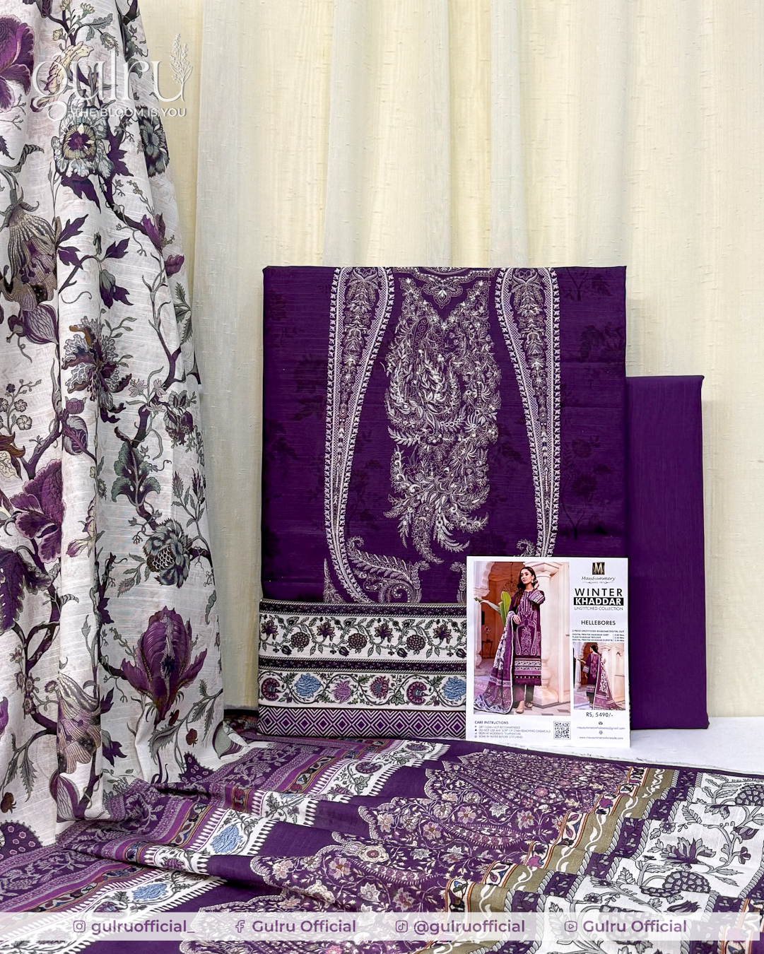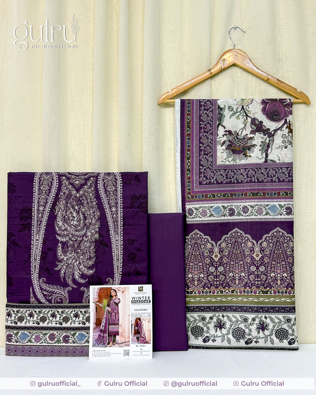 A rich purple set featuring a central paisley panel with fine vine work and a tidy ornamental border along the hem, easy to stitch in straight or A-line cuts. The ivory dupatta adds contrast with oversized botanical artwork and detailed borders that lift the whole look. A solid-dyed purple trouser keeps the outfit clean and balanced. Wearable for office, daily errands, and casual meetups through winter.