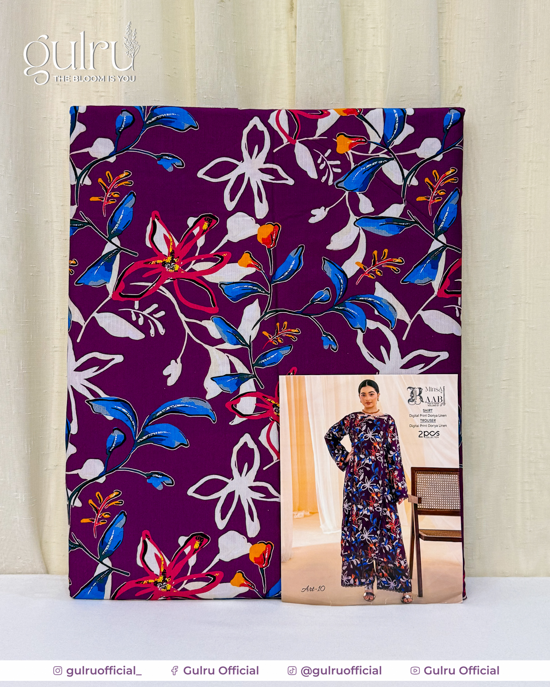 2-piece unstitched set featuring a digitally printed Dorea linen shirt with an all-over floral print and a matching digitally printed  trouser. Soft handle, breathable, and easy to stitch for straight, A-line, or maxi cuts. Ideal for casual wear.