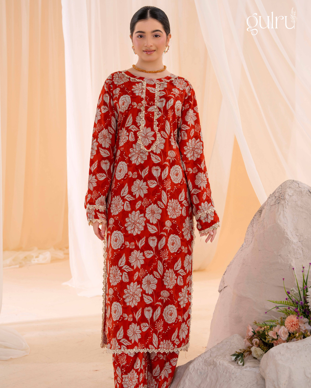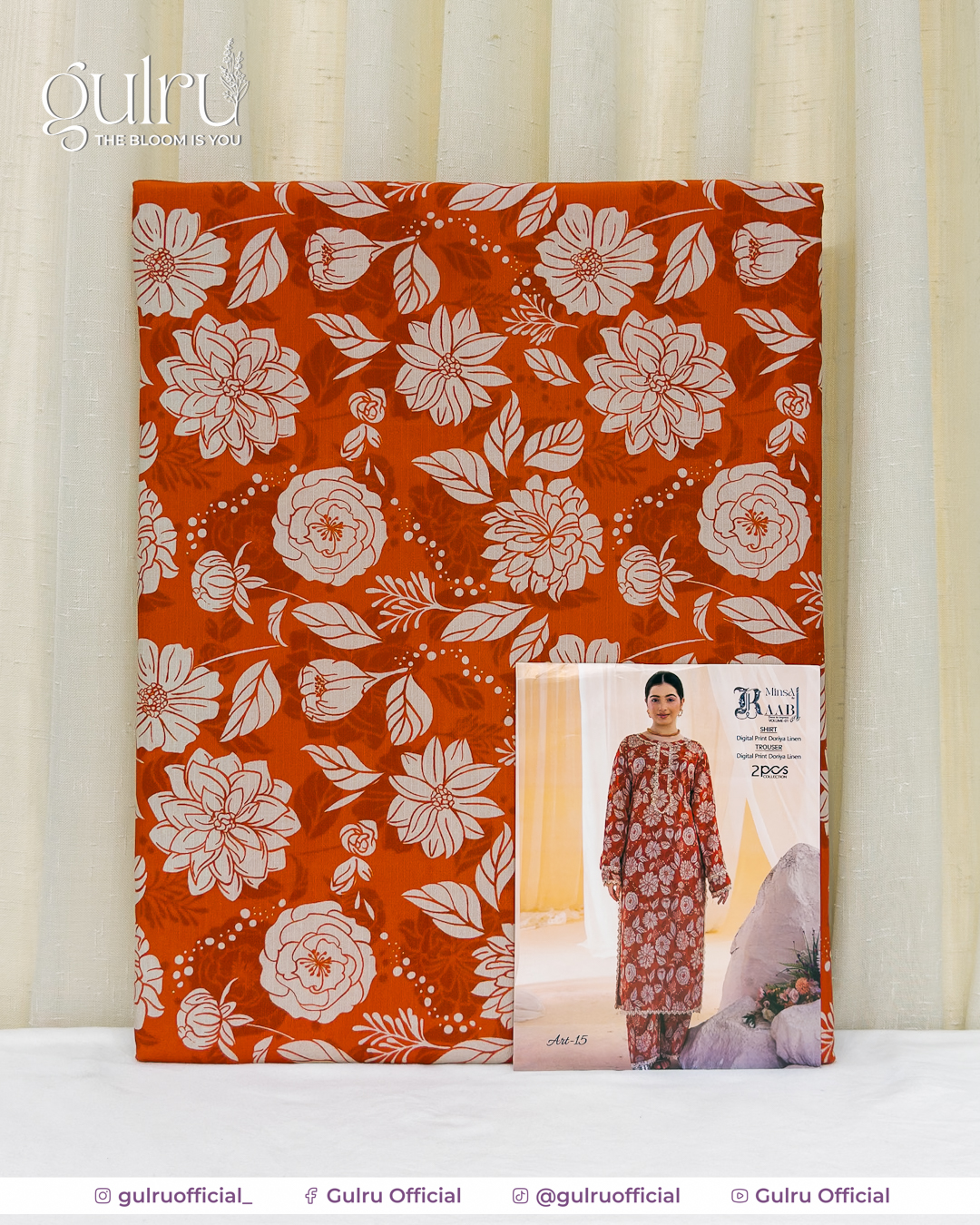 2-piece digitally printed linen set. Straight shirt in burnt orange with bold ivory floral print all over and coordinated printed trouser. Medium-scale motifs keep it balanced for everyday wear and easy tailoring in straight or A-line cuts. Soft, breathable winter linen that styles well with a plain cream or beige shawl if you want to add a layer.