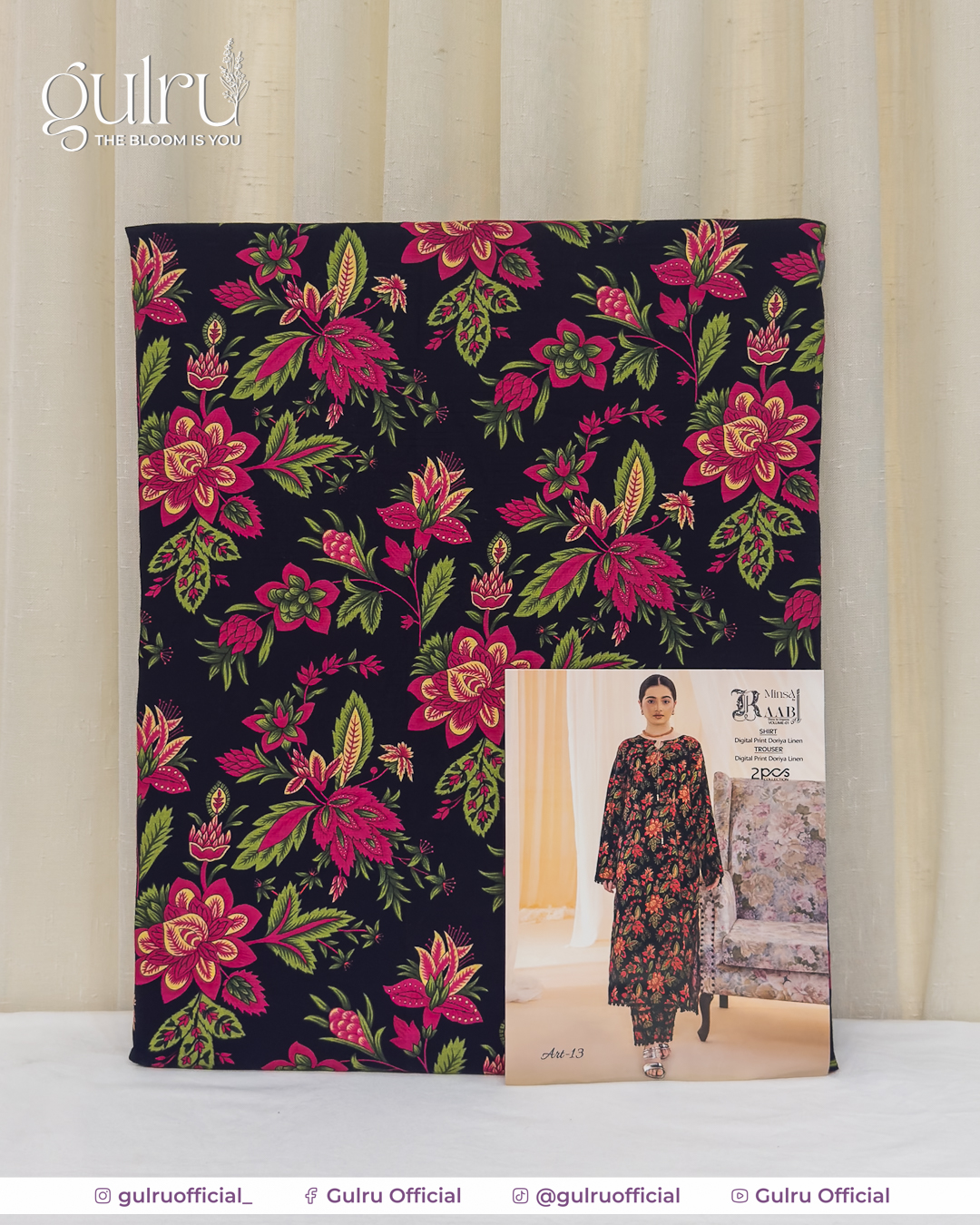 Two-piece unstitched linen set. The shirt carries bold botanical clusters on a deep black canvas that reads rich without looking busy. The matching printed linen trouser keeps the look cohesive and stylish. Cuts cleanly into straight or A-line silhouettes and works well for day-to-evening wear with nude heels or gold flats.