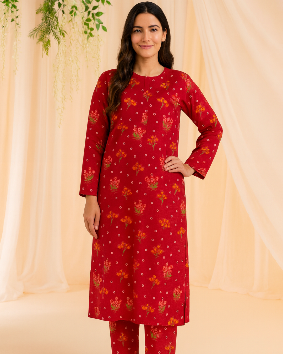 Two-piece unstitched printed linen set. Digital printed shirt with scattered bouquet motifs and small dot elements that stitch cleanly in straight or A-line cuts. Coordinating dyed linen trouser keeps the look balanced and easy to pair. Soft handle and breathable feel make it a solid pick for everyday wear.