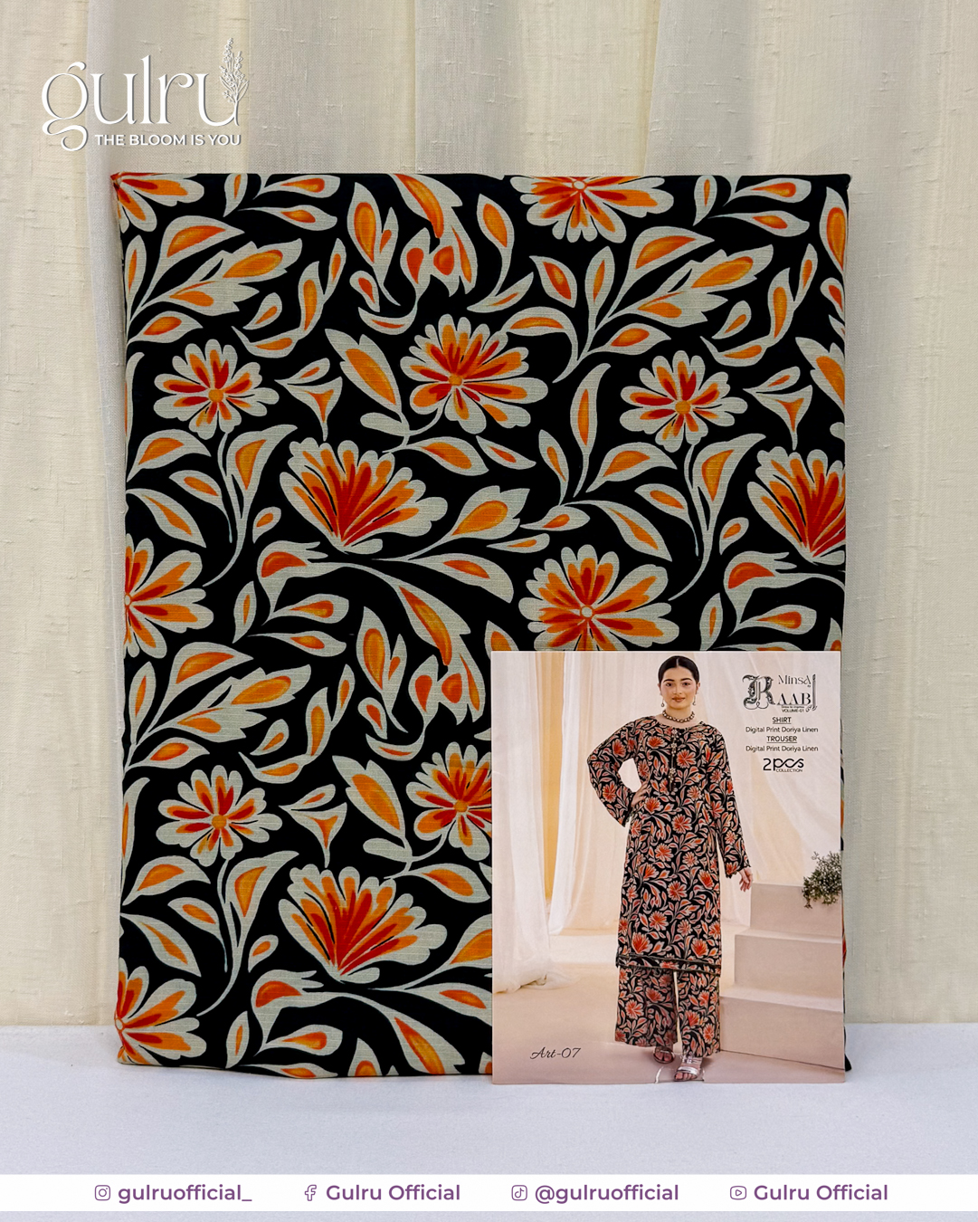 Two-piece digitally printed linen set. The shirt is straight cut with full sleeves and a round neckline, carrying a bold floral print in orange, cream, and green on a black base. The same print continues on the straight trousers for a coordinated look. The pattern is crisp and evenly placed, so it stitches cleanly in a simple straight silhouette. Good for daily wear when you want something striking but easy to style.