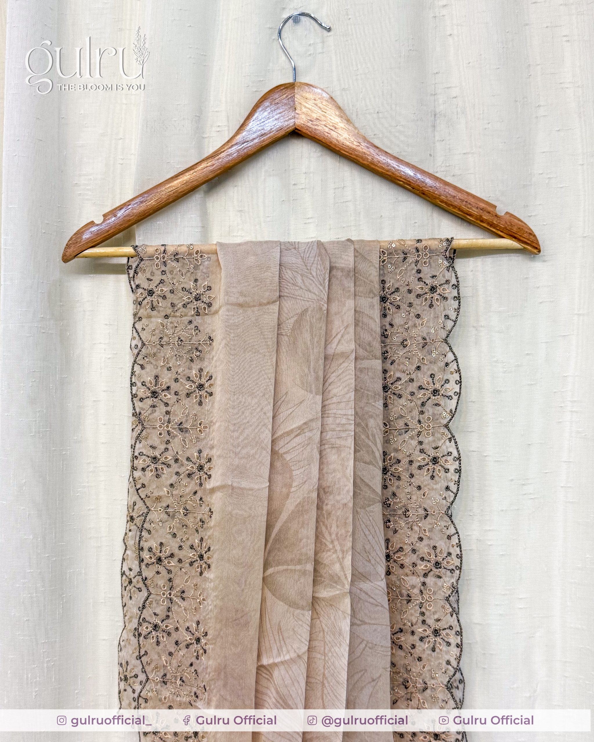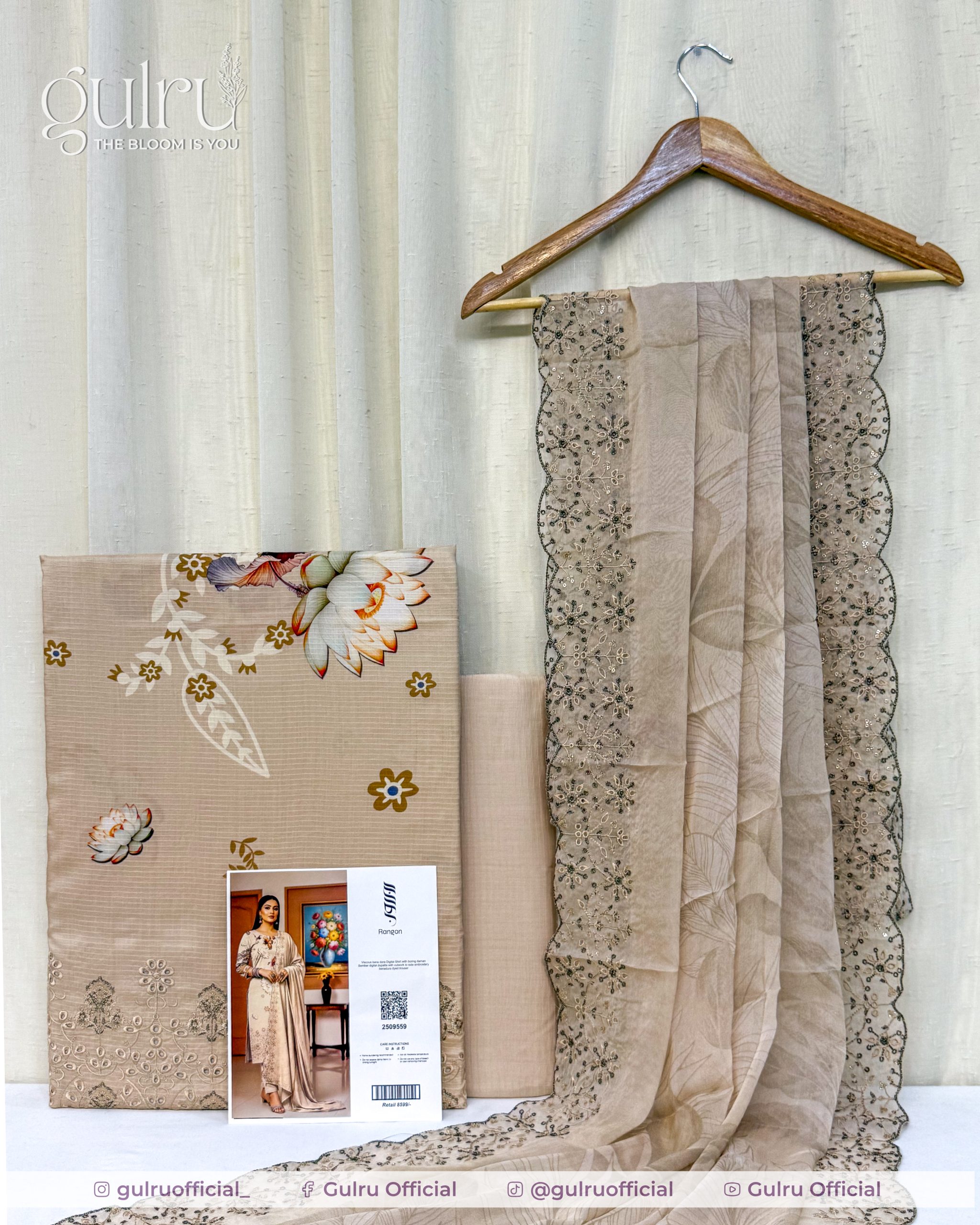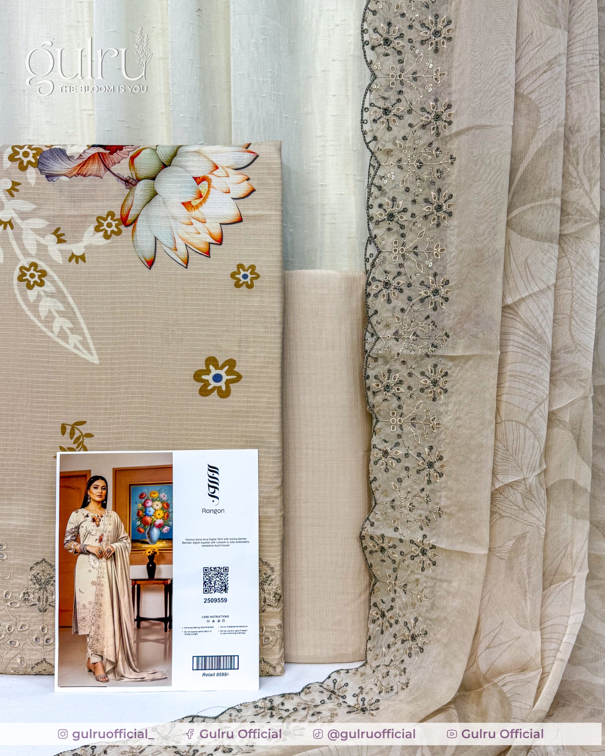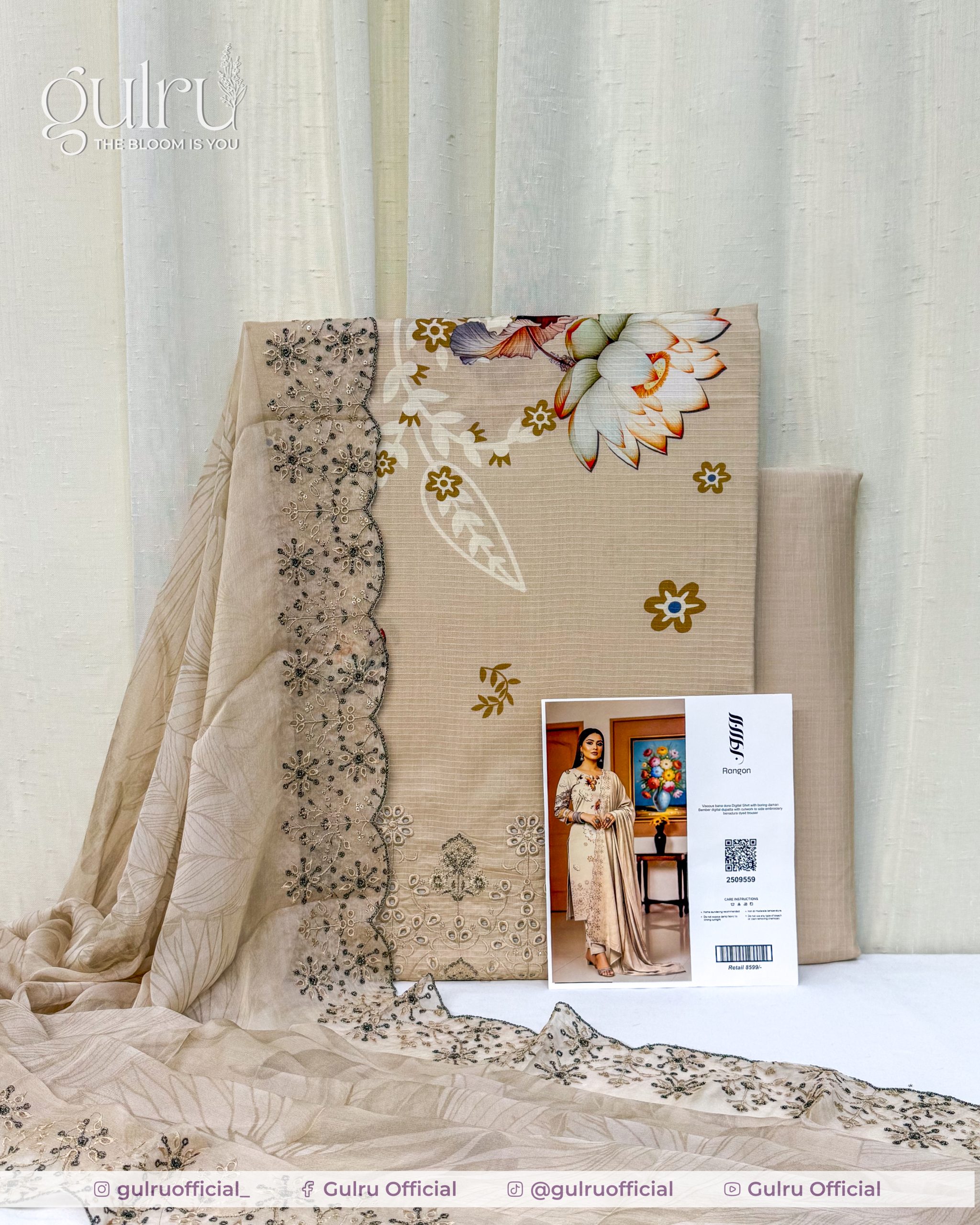 Digital printed viscose shirt with soft lotus florals and delicate side embroidery on the daman. Bember digital dupatta featuring sheer fabric with cutwork and a beaded floral border for a dressy finish. Benadura dyed trouser in a matching beige to ground the print—a clean, elegant three-piece ideal for daytime events and semi-formal wear.