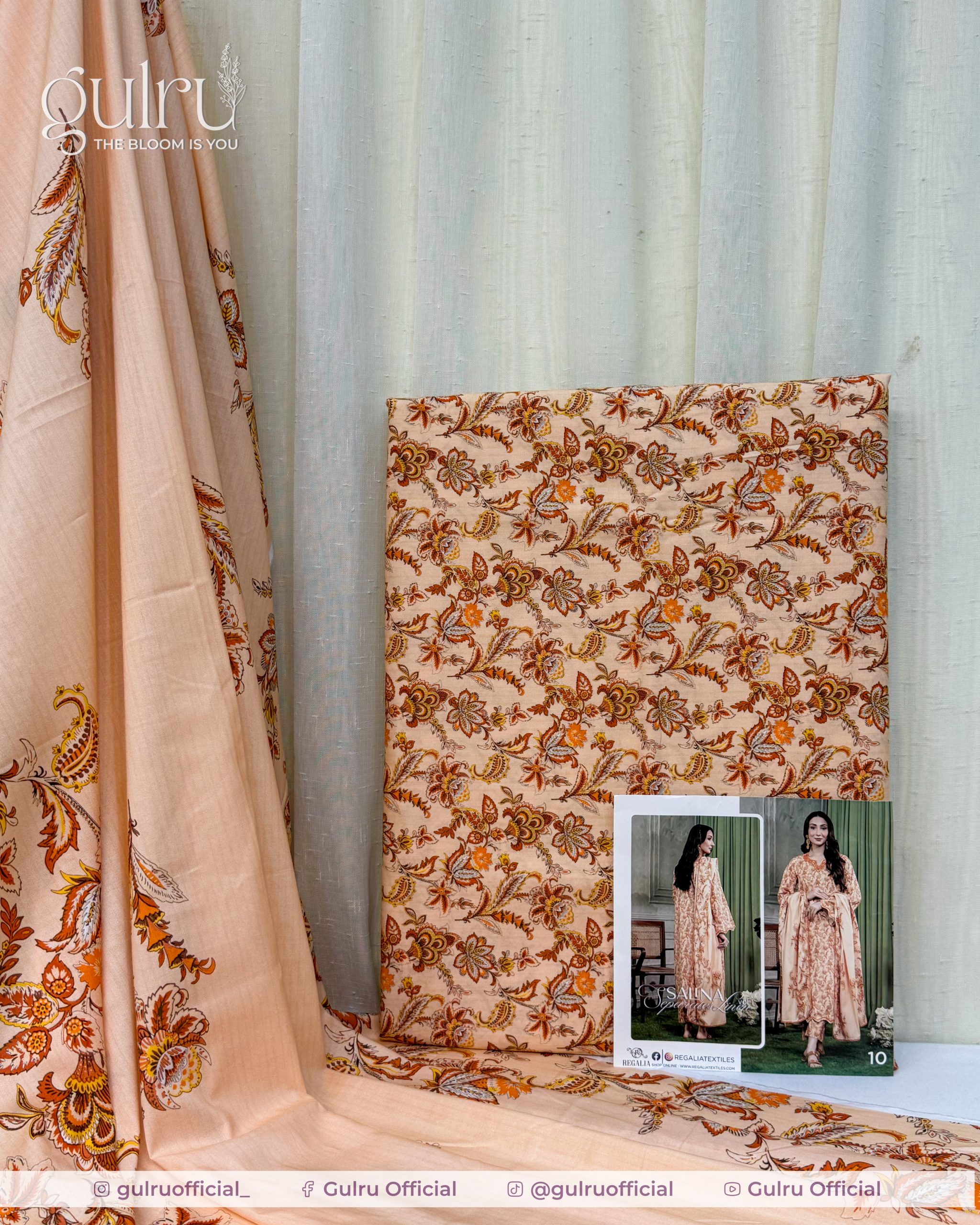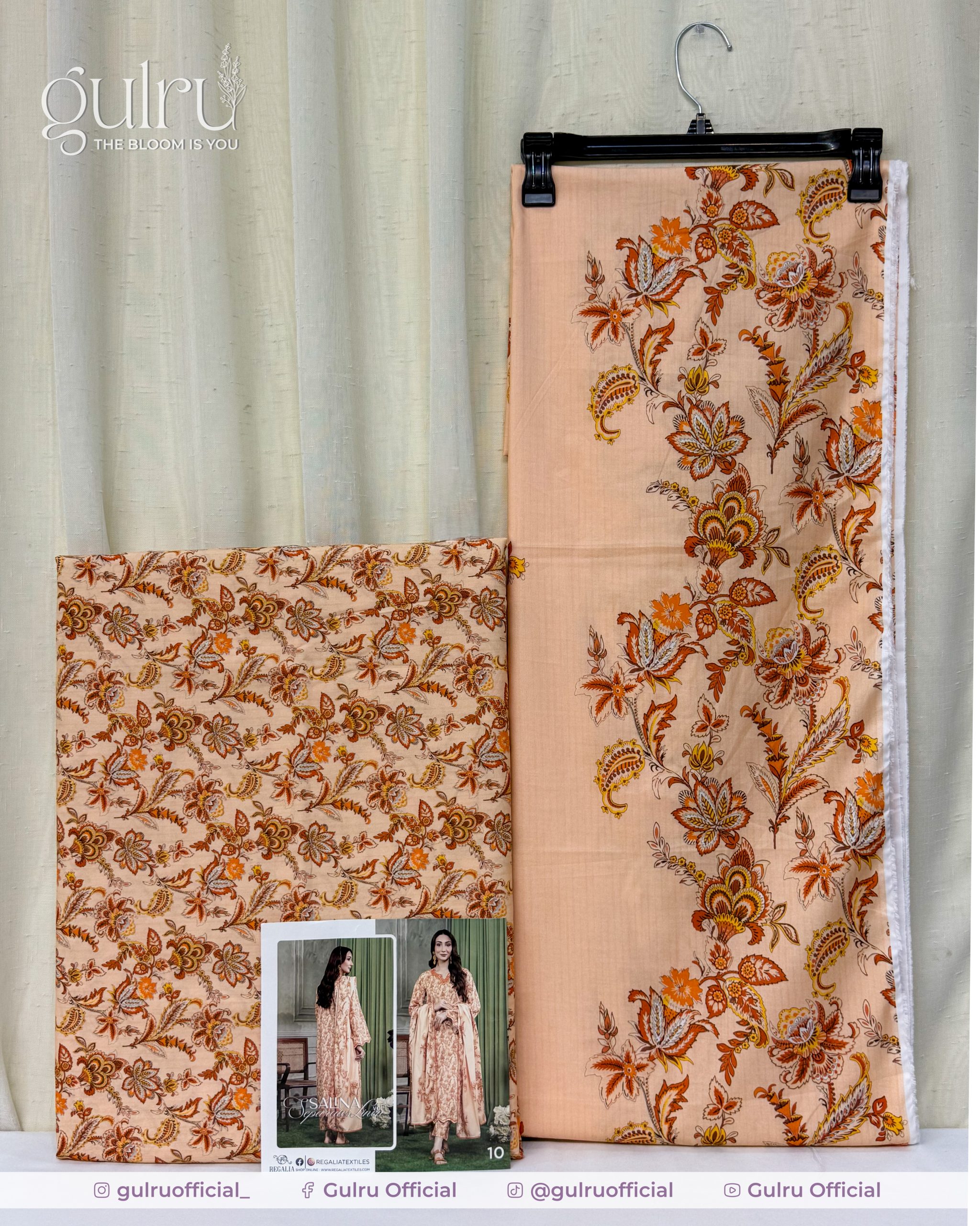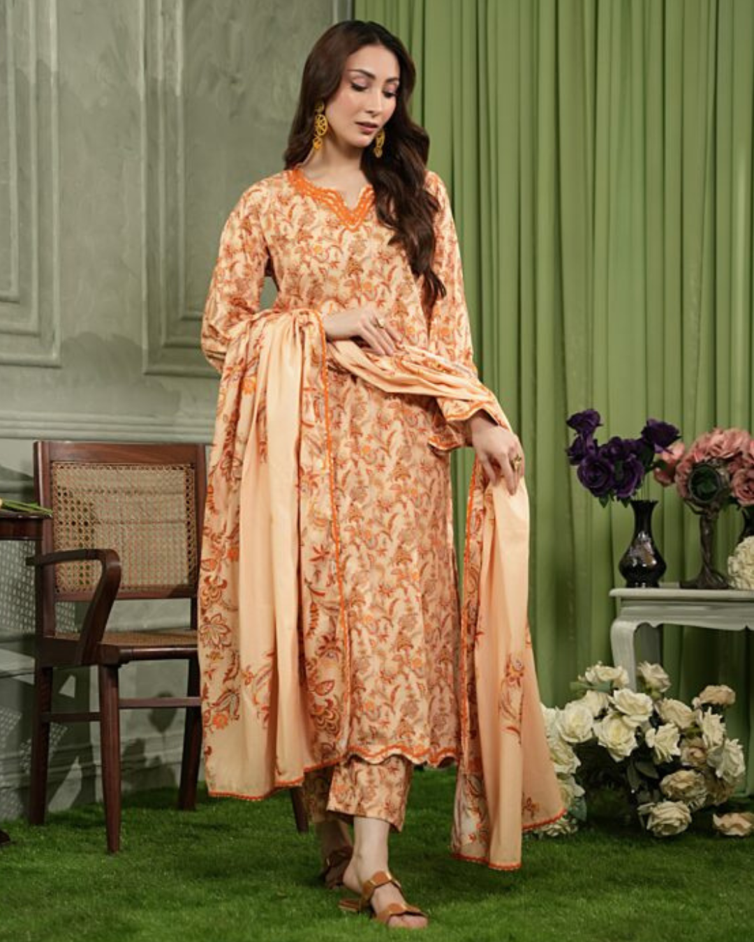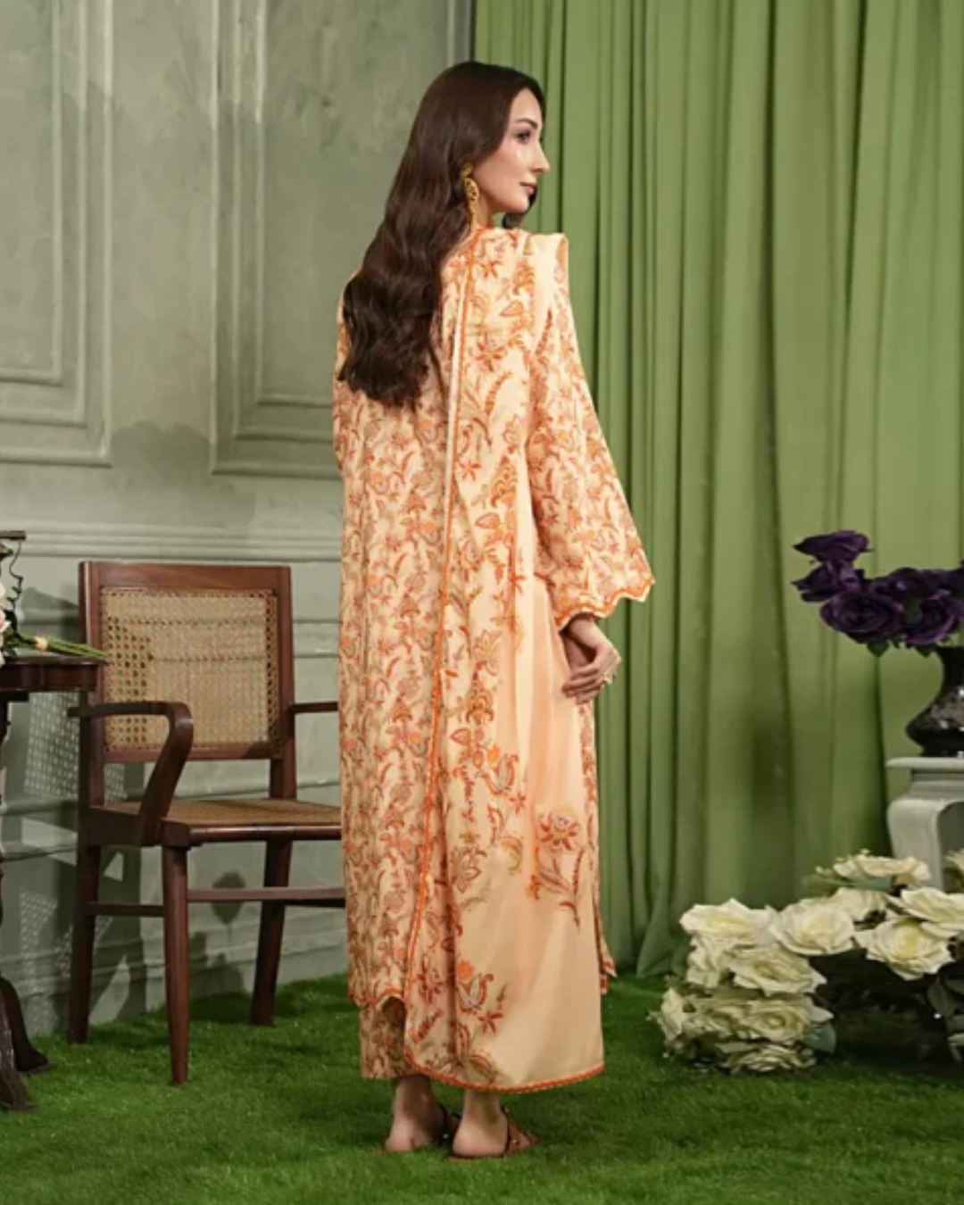 A soft peach base sets a refined canvas for this Salina Separates Linen set. The shirt features an allover botanical vine with fine paisley accents and a coordinated border that frames the front neatly. The trouser uses the same matching printed linen for a cohesive head-to-toe look. A light, airy printed dupatta completes the set with complementary motifs and borders, keeping the palette warm and flattering for daytime wear and semi-formal gatherings.