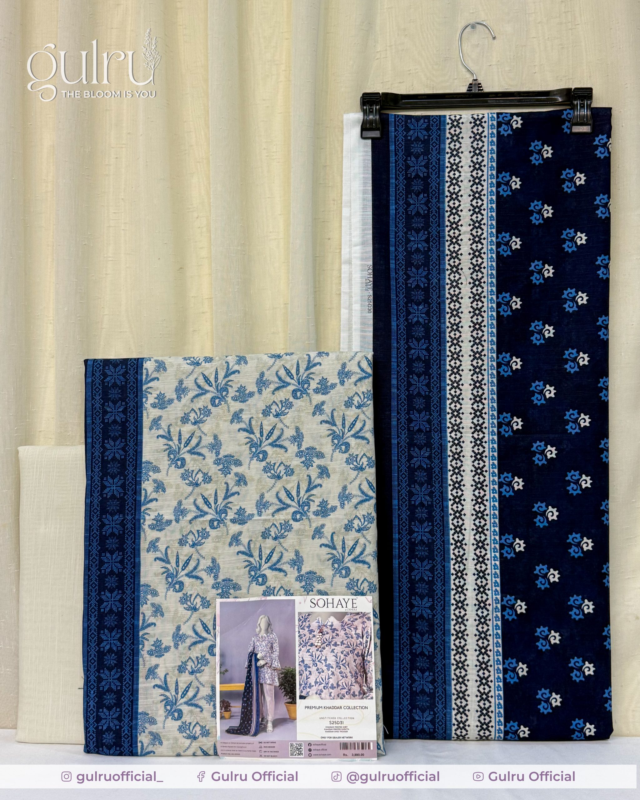 All-over vine and floral print on an ivory base with a deep navy panel border gives this suit a clean, airy look. The dupatta carries small navy motifs with a geometric edge, so it frames the shirt without feeling heavy. Pairing with a light trouser keeps the palette balanced and day-friendly. Works for everyday wear, office, and casual meetups.