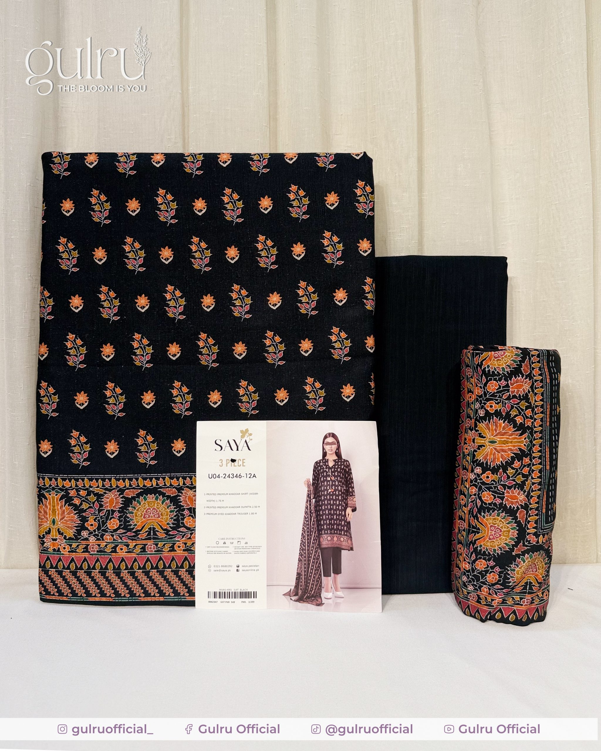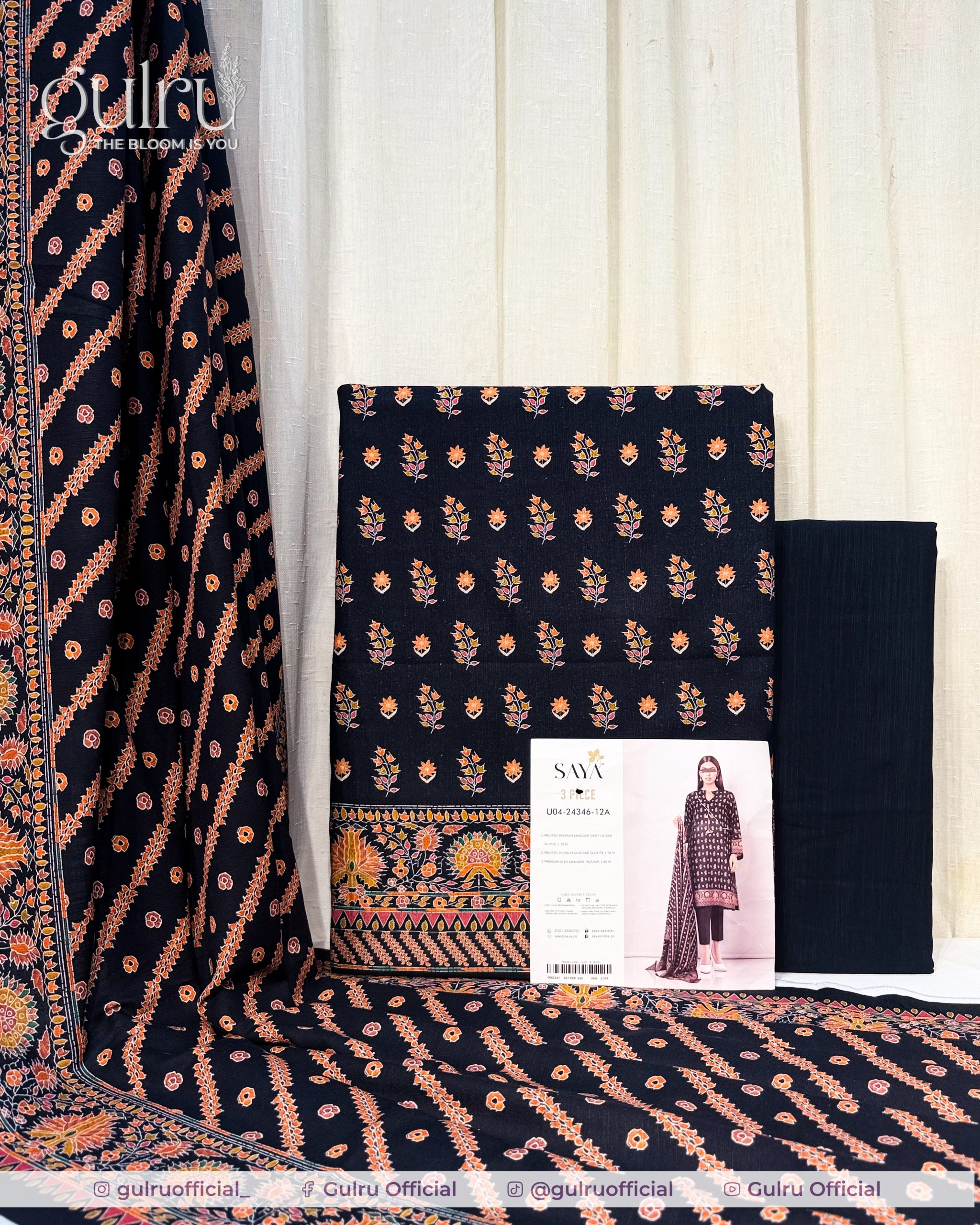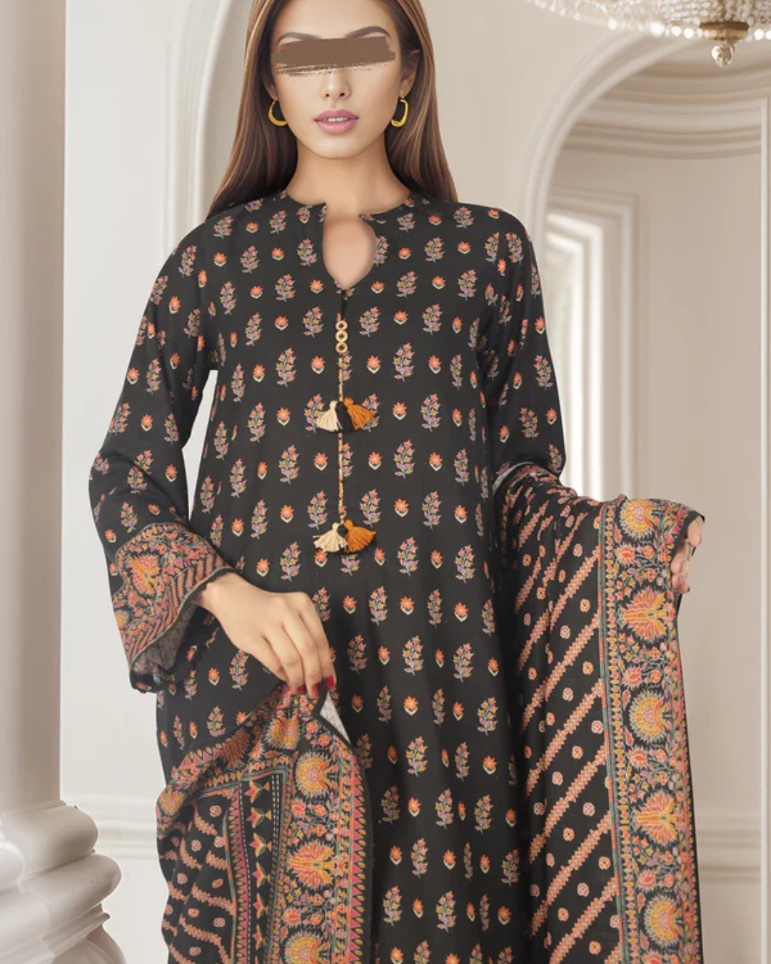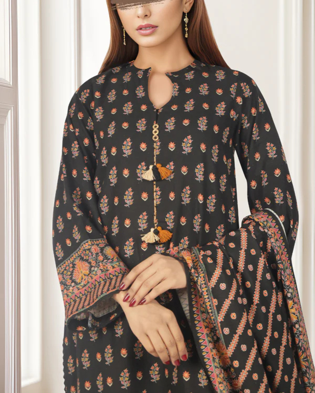 This black 3-piece suit features small buta-style motifs throughout the shirt and heavier borders, giving it a classic ethnic look. The printed dupatta repeats the same elements, and the plain black trouser keeps the outfit versatile for work or semi-formal dinners.