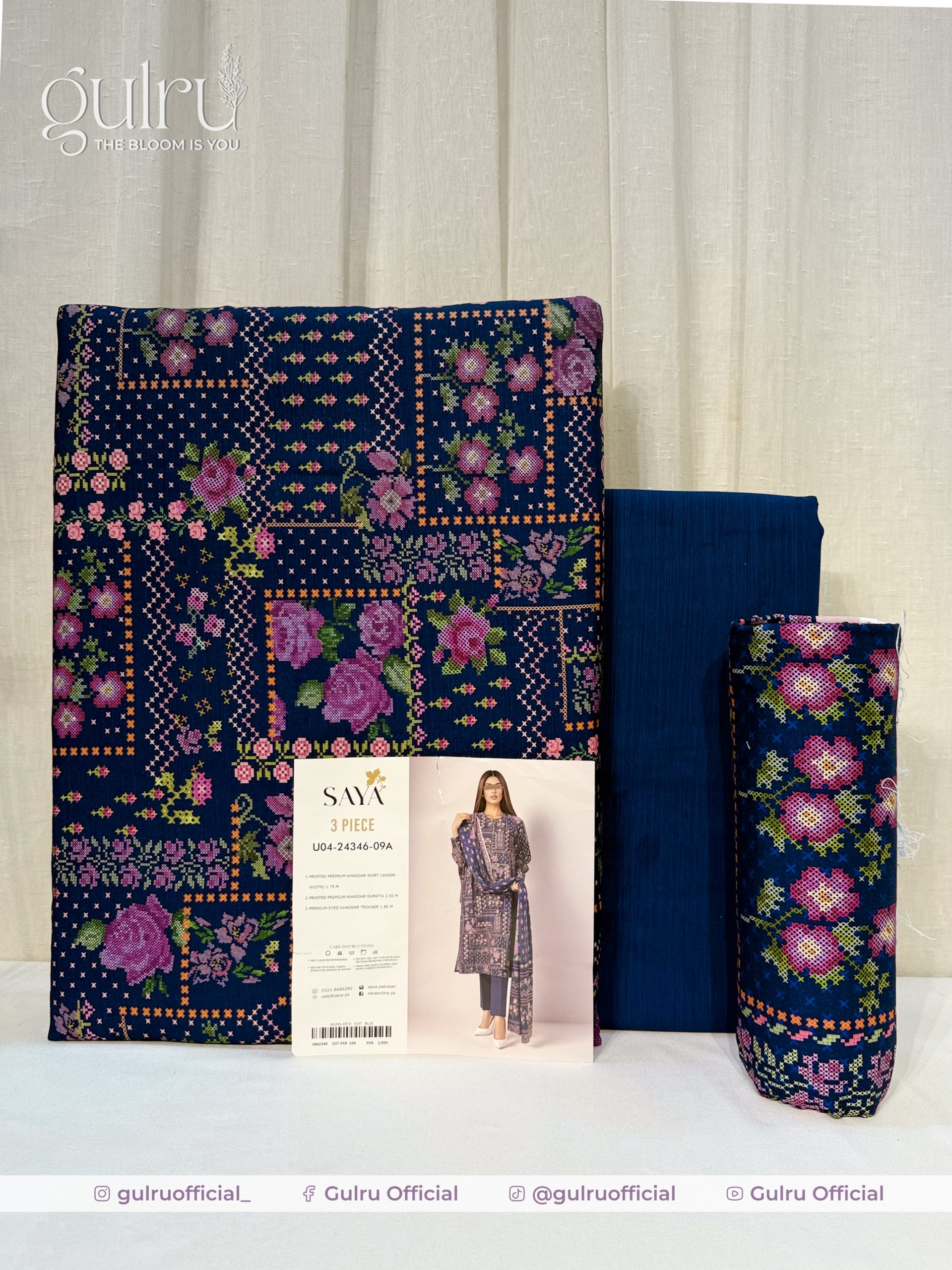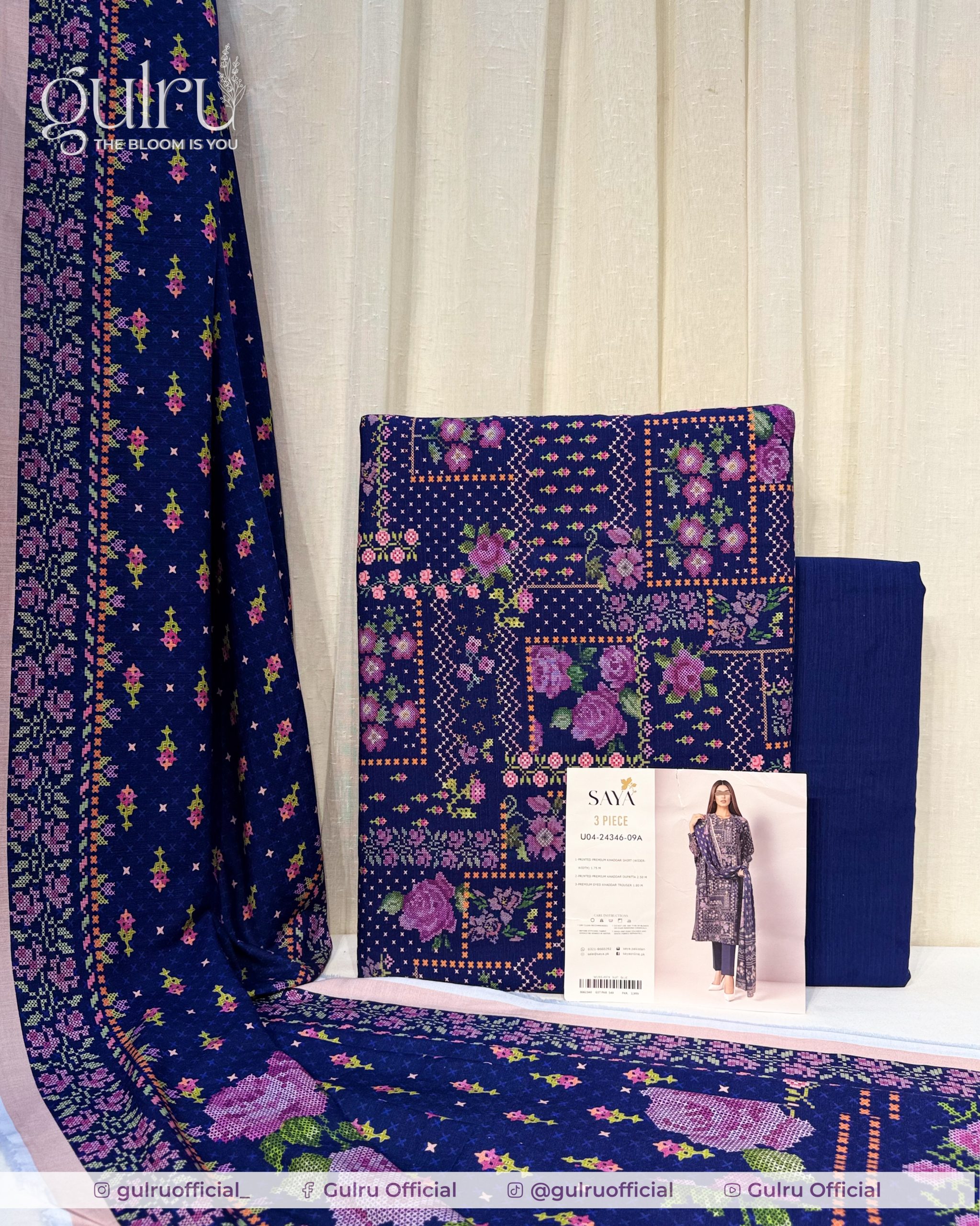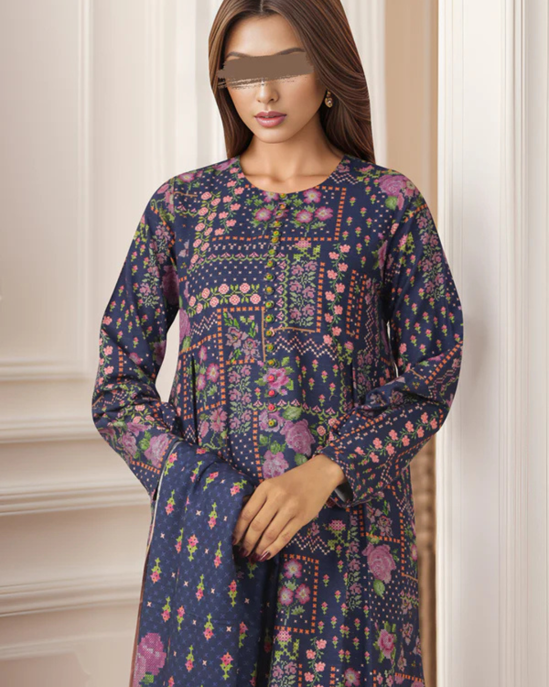 This navy 3-piece unstitched suit has a patchwork-inspired floral and geometric print that gives a rich, cross-stitch look. The matching printed dupatta and dark trouser make it a good option for work, dinners, and travel in the colder months.