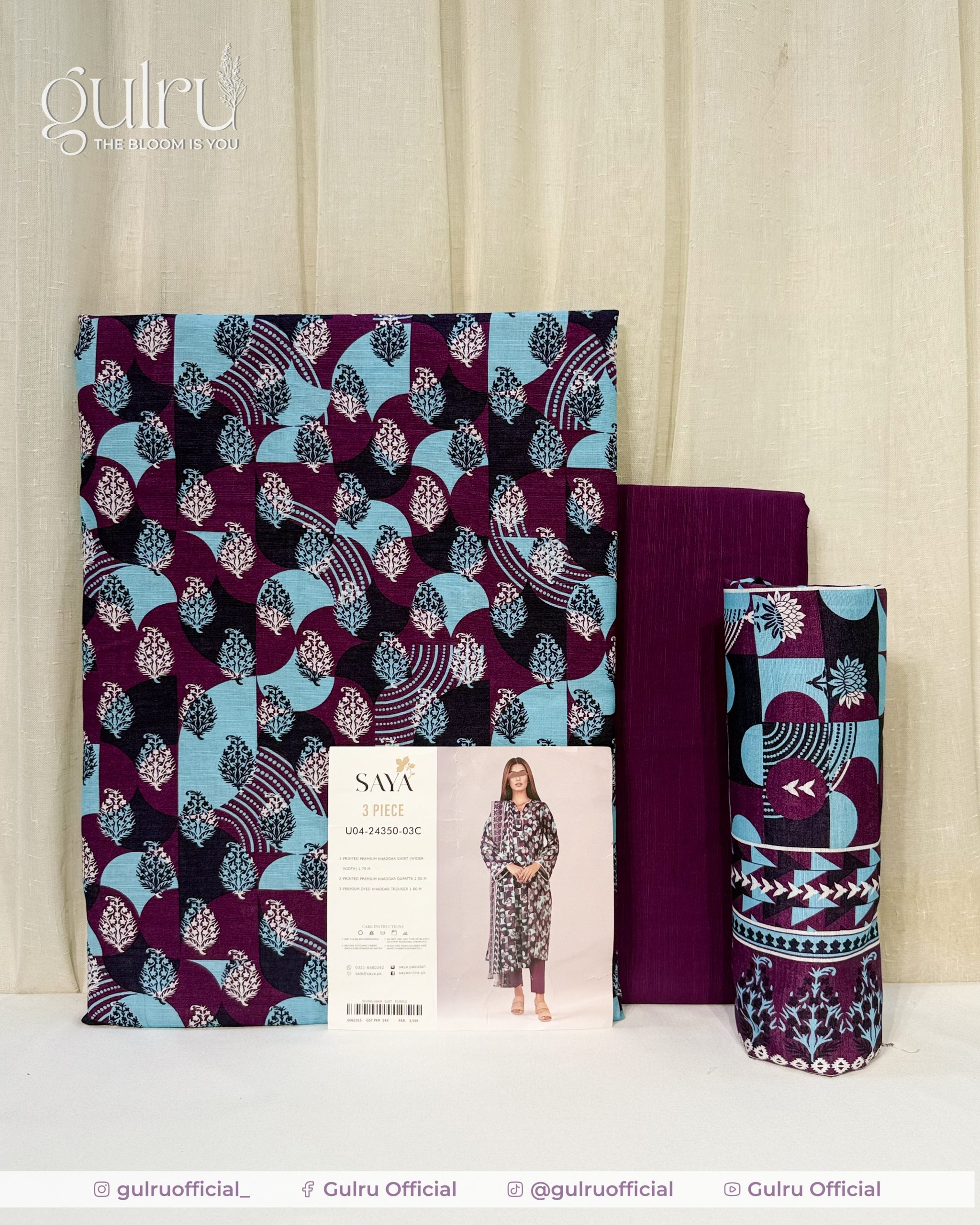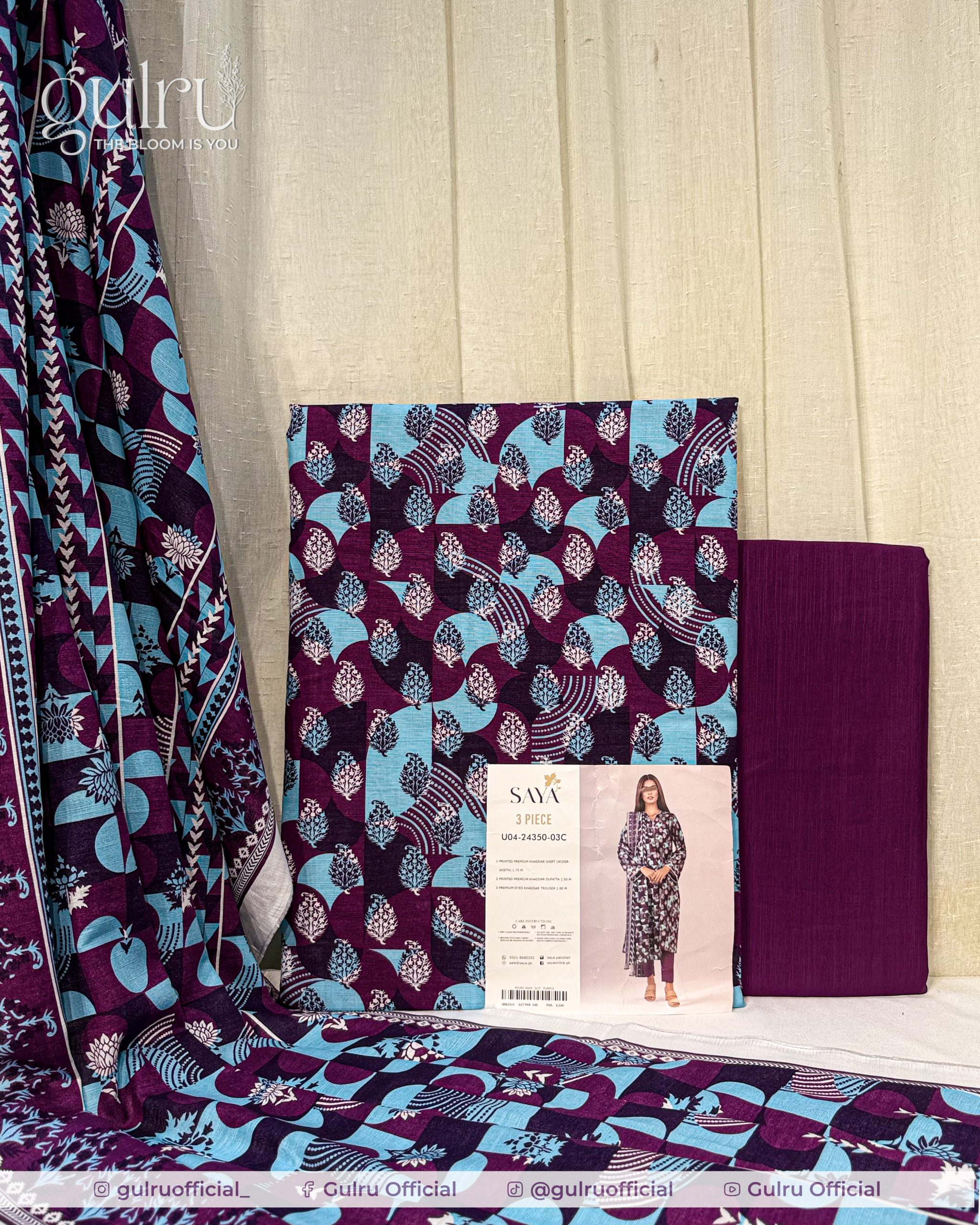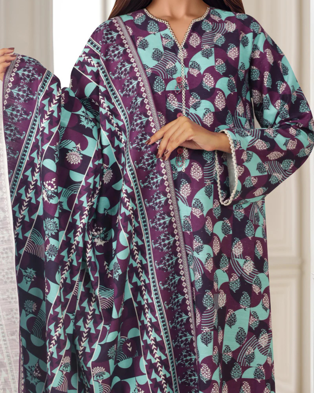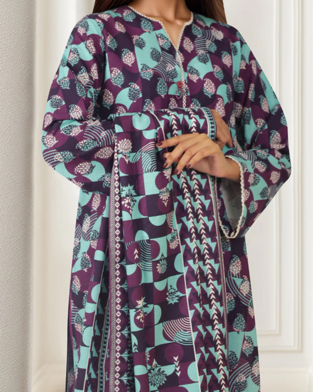 This purple and teal unstitched suit features a bold block-style leaf pattern that gives a graphic look without feeling too loud. The printed dupatta follows the same color story, and the plain plum trouser keeps the outfit sharp for office or casual wear.
