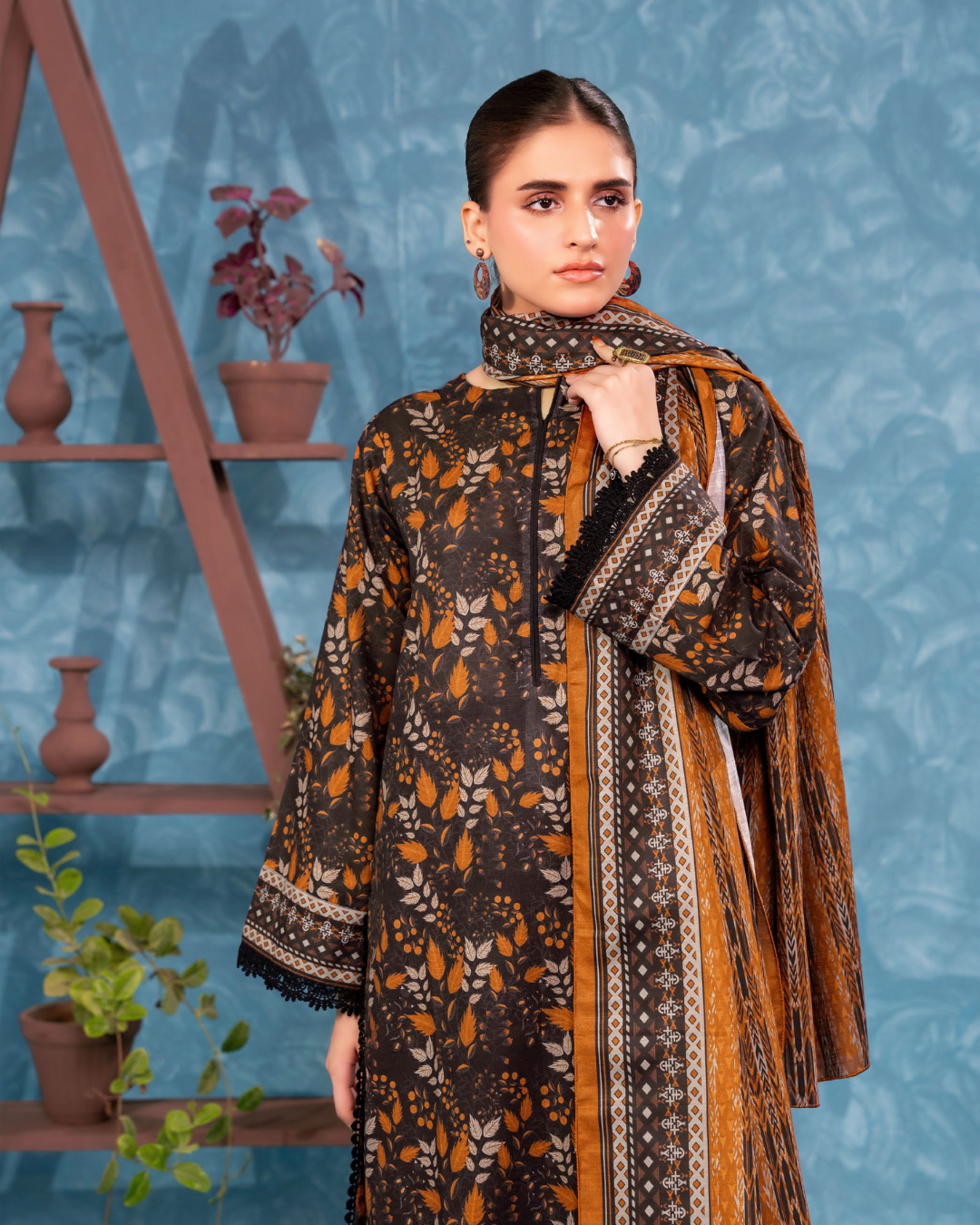 Dense leaf and vine print on a dark brown khaddar shirt with a slim side border for neat cutting. Chevron and tribal-style printed dupatta in mustard, brown, and cream that adds movement without looking loud. Plain mustard trouser to balance the busy top and keep tailoring simple. Winter-friendly fabric that stitches clean in straight line cuts and works for office or everyday wear.