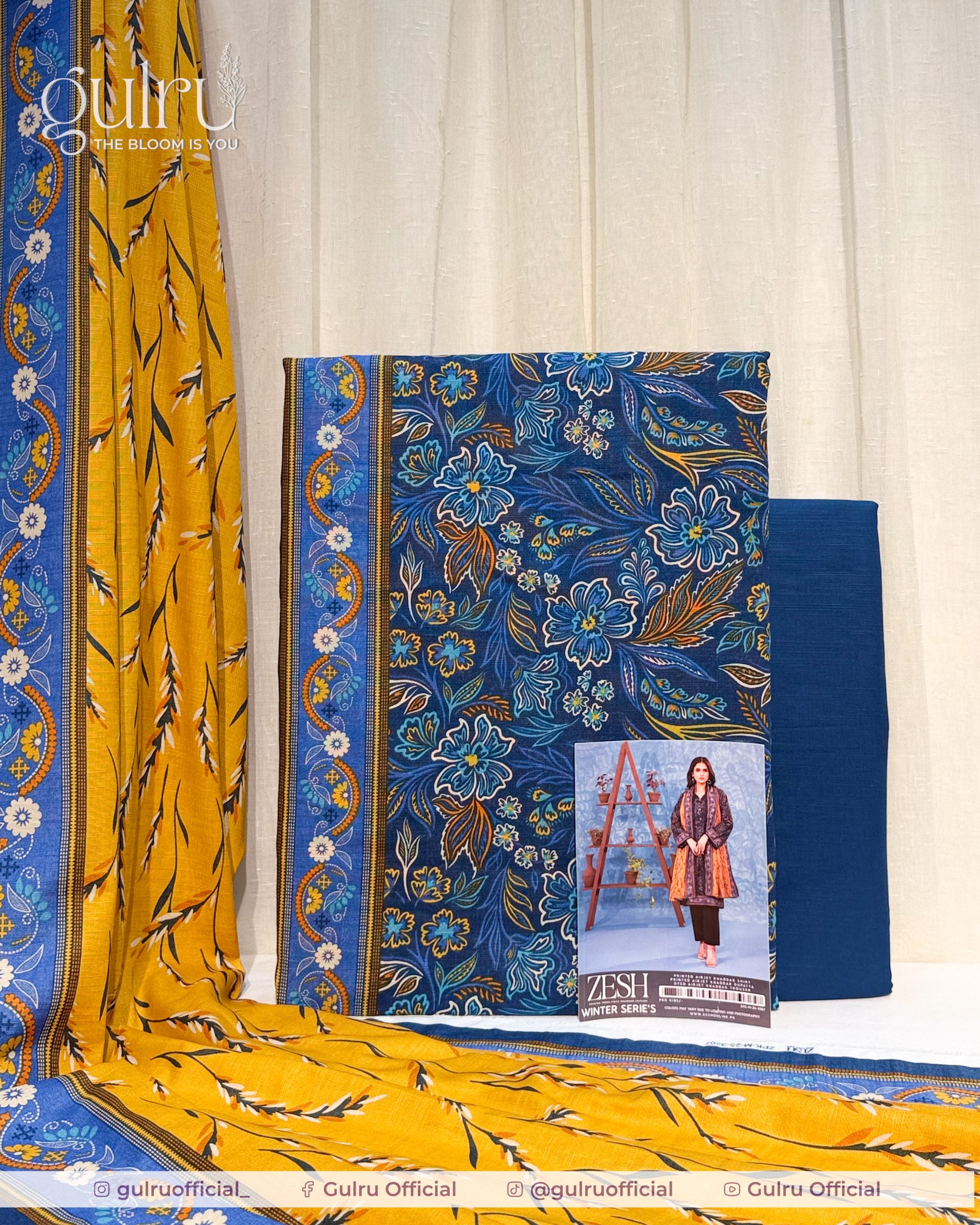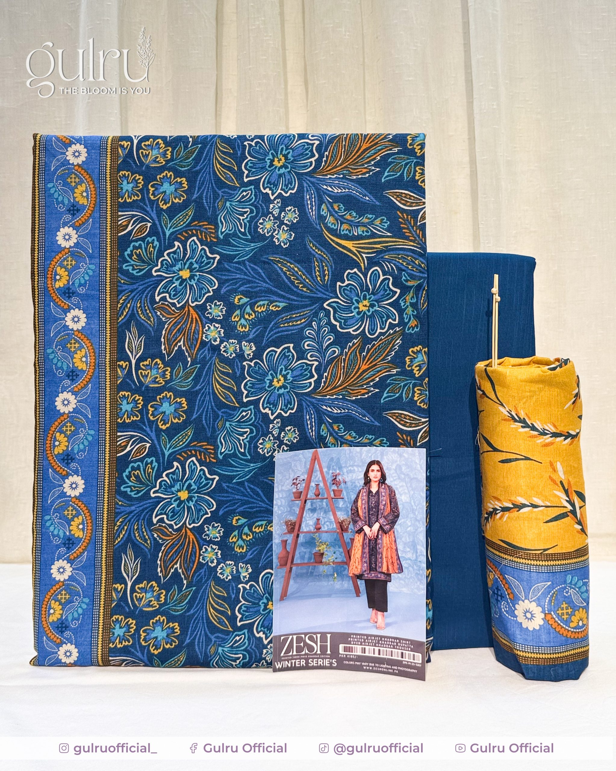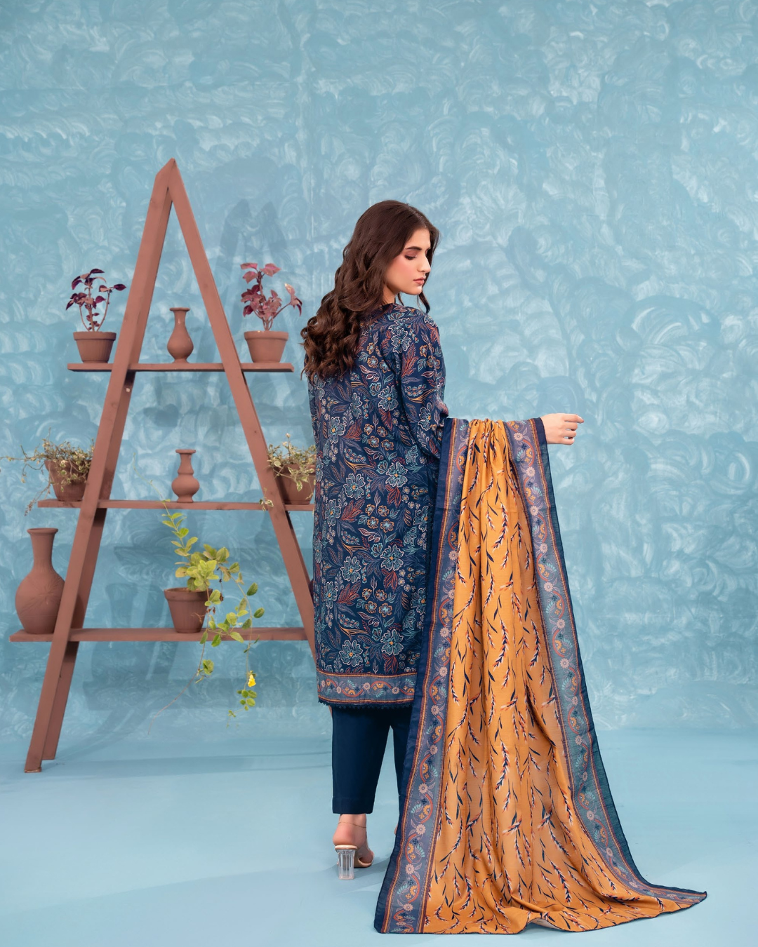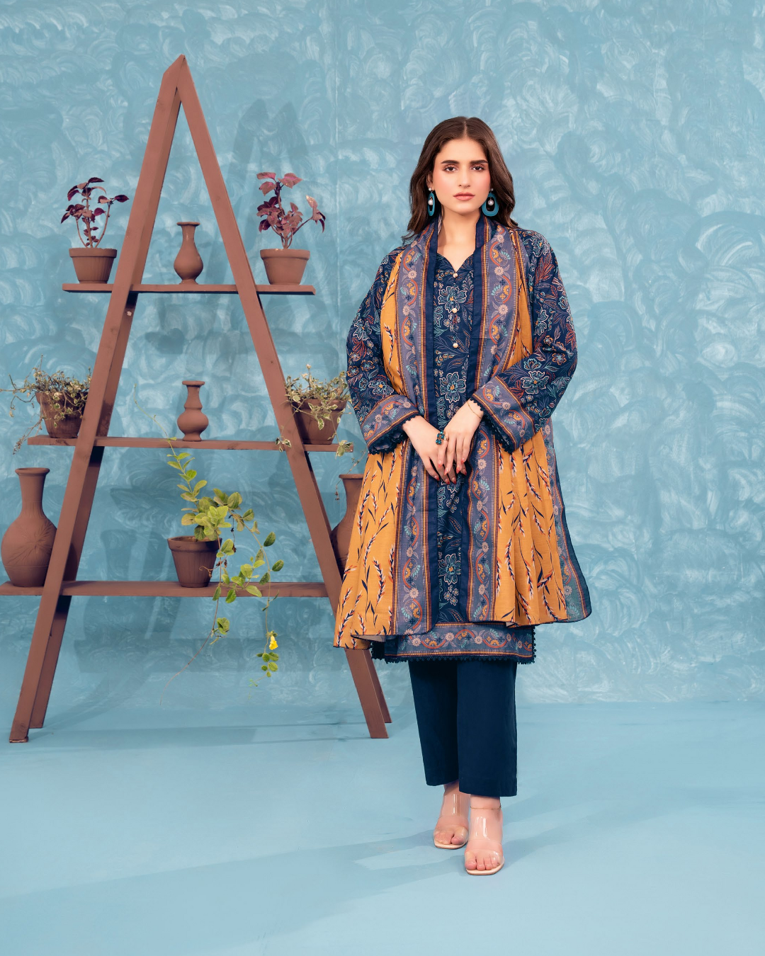 Printed khaddar shirt with dense floral vines in teal, sky blue, and mustard, finished with a coordinated blue border. Contrast the printed dupatta in mustard yellow with a blue border and slim leaf motifs that pop against the shirt. Plain navy trouser keeps the look clean and easy to stitch in straight-line cuts. Crisp winter-friendly fabric suited for daily wear, casual meetups, and the office.