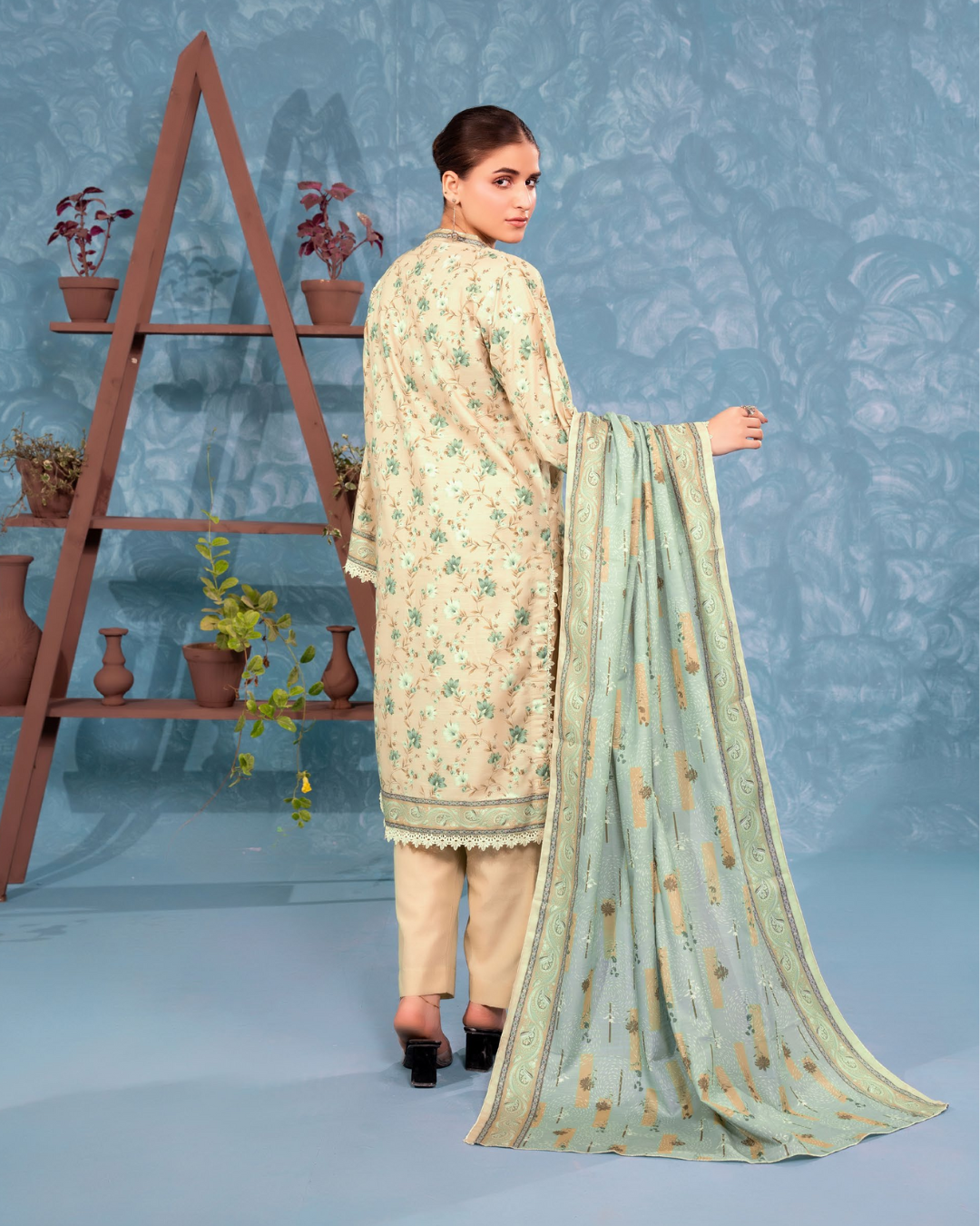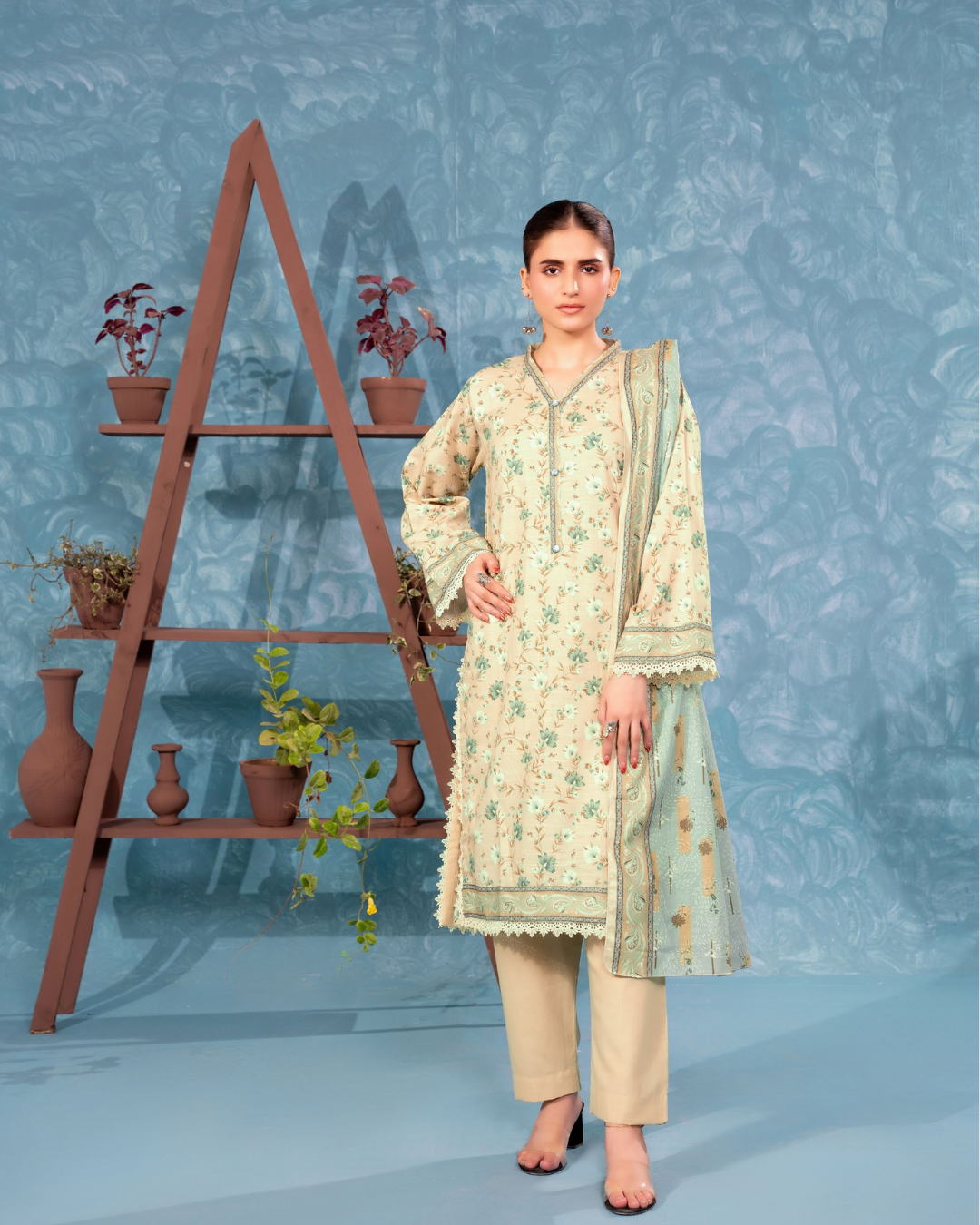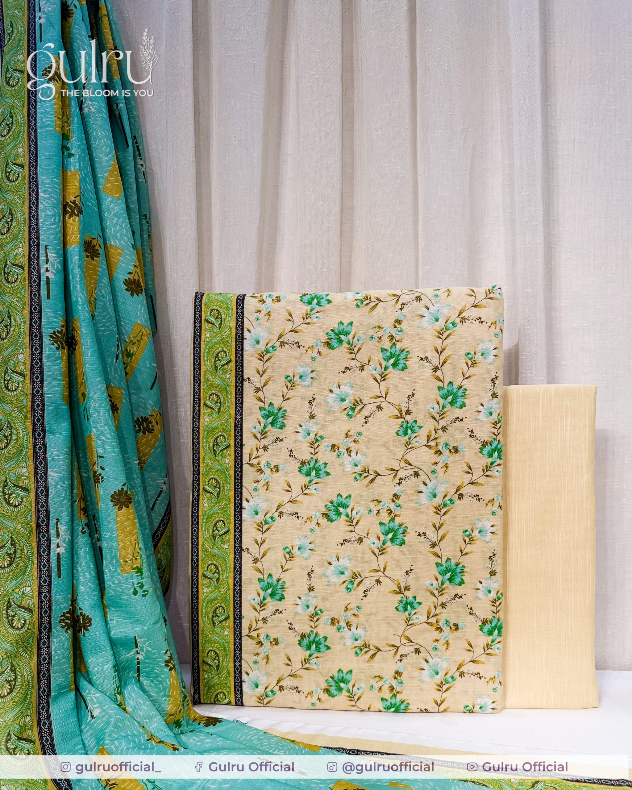 A beige base with teal and white floral vines and a slim paisley border in lime and black keeps the shirt fresh and tidy. The dupatta switches to a sea green ground with coordinated borders for contrast. A plain cream trouser balances the print and keeps tailoring simple. Good pick for daytime wear when you want color without heavy embellishment.